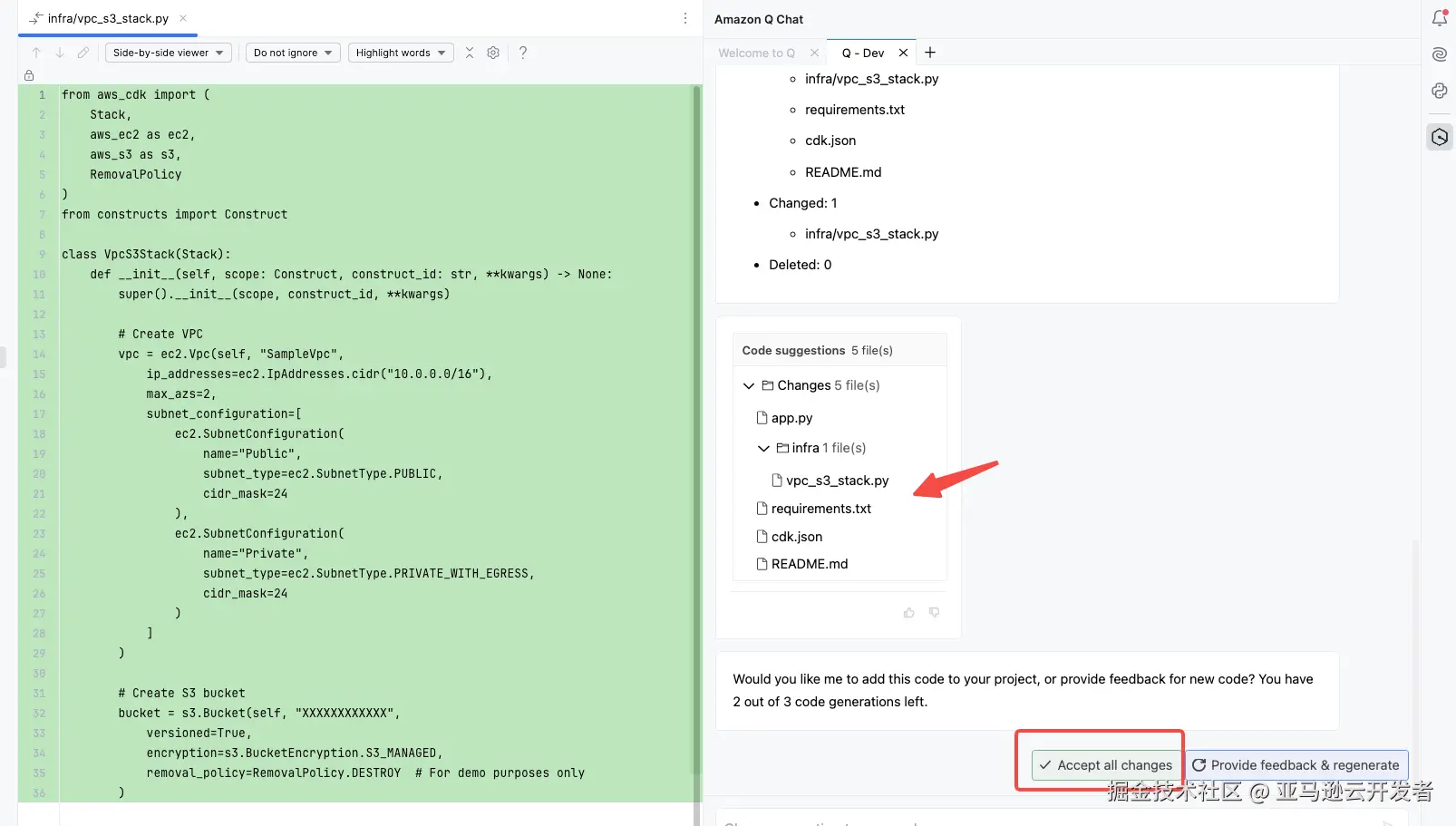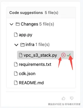 在箭头所区域,为 Amazon Q 给予的 Code Suggestion,可以看到 Amazon Q 将会改变 5 个文件,可以点击任意的一个文件,去查看具体的变更,本例展示了点击名为 vpc_s3_stack.py 的 CDK 代码,可以在左侧看到完整的源码(关于 CDK,本文不做深入展开)。可以选择点击 Accept all changes 来接受全部变更,也可以单独点击某个文件旁边的勾/叉,去逐一接受/拒绝文件级别的变更。如下图所示。