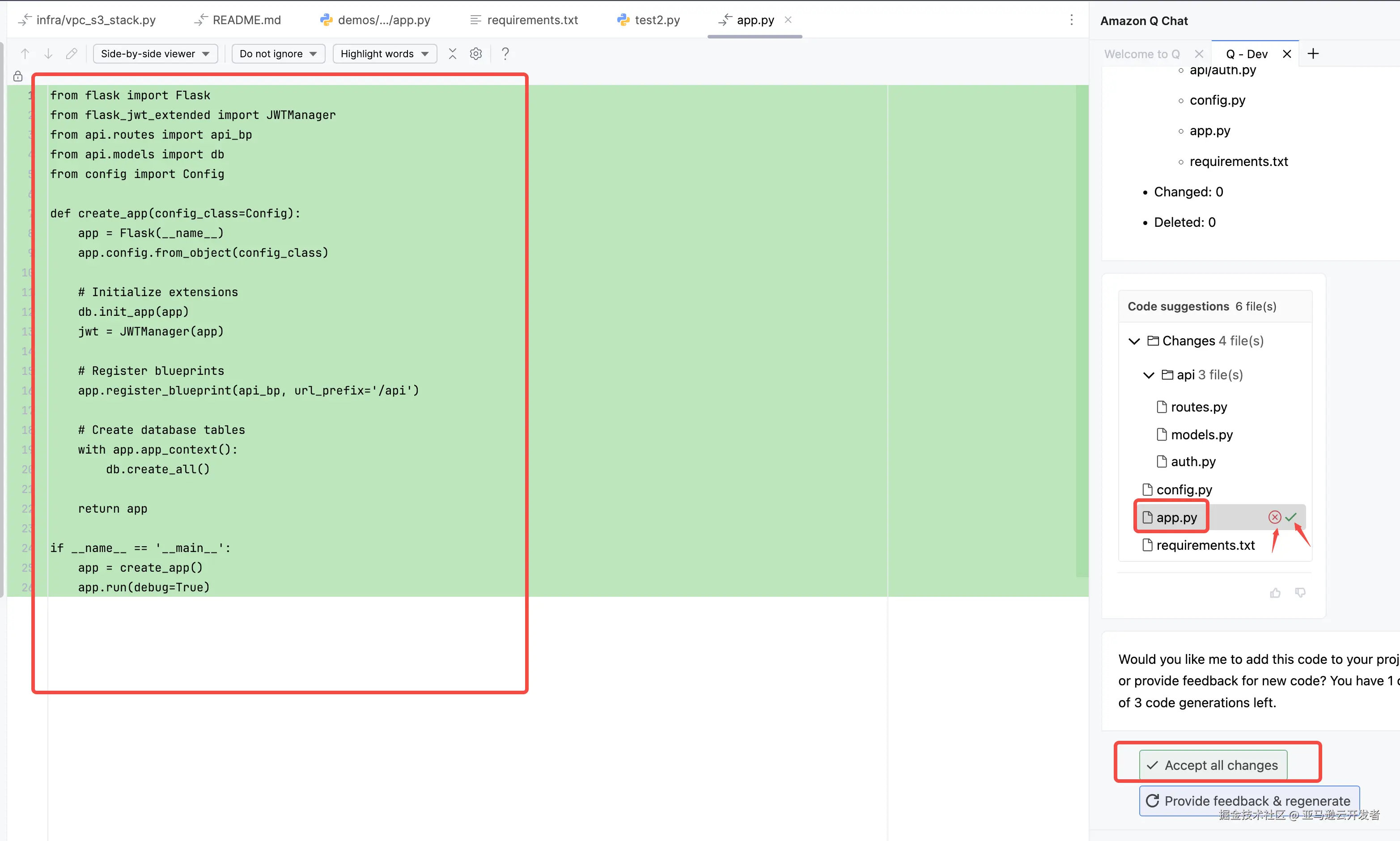 然后点击 Confirm,Amazon Q 会生成代码变更,并在编辑器中,以 diff 代码的方式展现给开发者,红色表示变更前的老代码,绿色是变更后的版本。