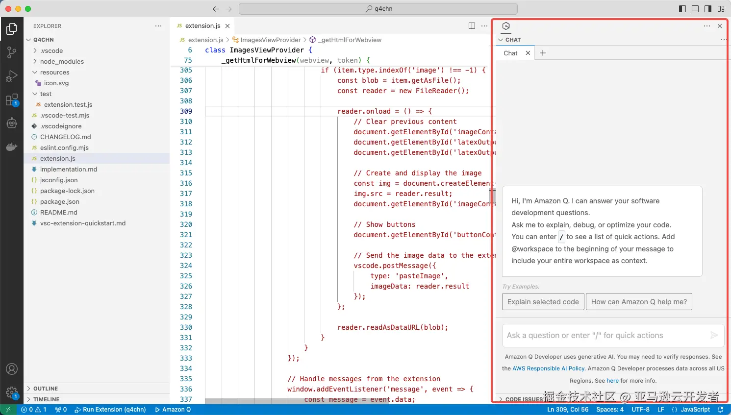 Chat Window 是红色方框显示的区域, 是 Amazon Q 提供给开发者最主要的使用自然语言进行交互式开发的用户界面。如下图所示。