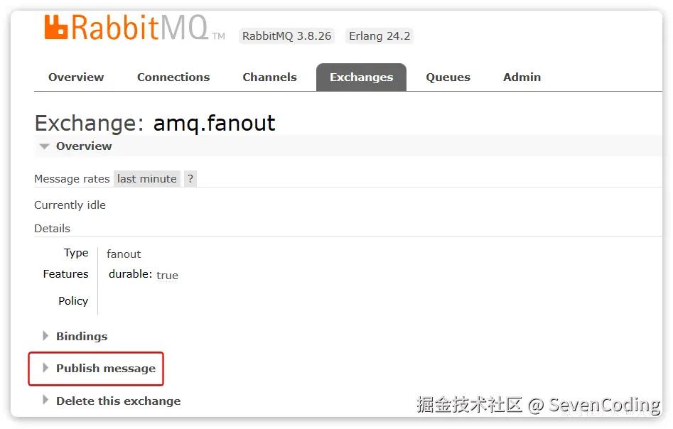 点击任意交换机,即可进入交换机详情页面。仍然会利用控制台中的publish message 发送一条消息: