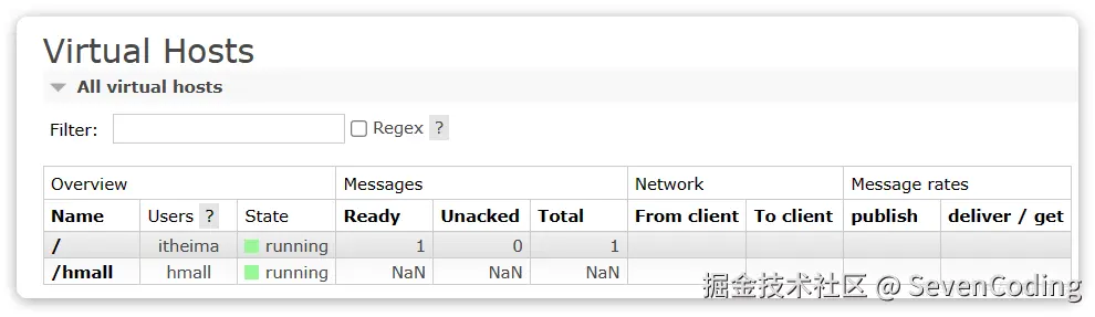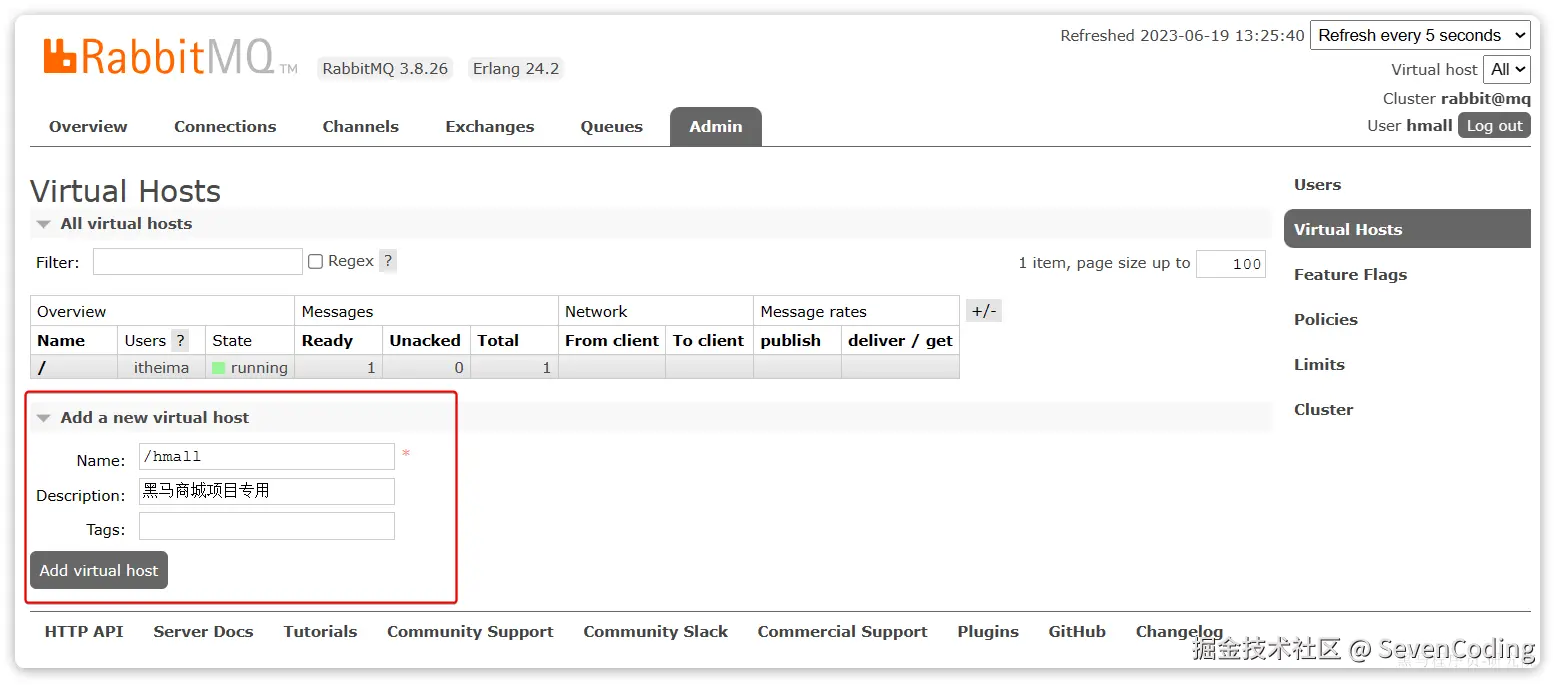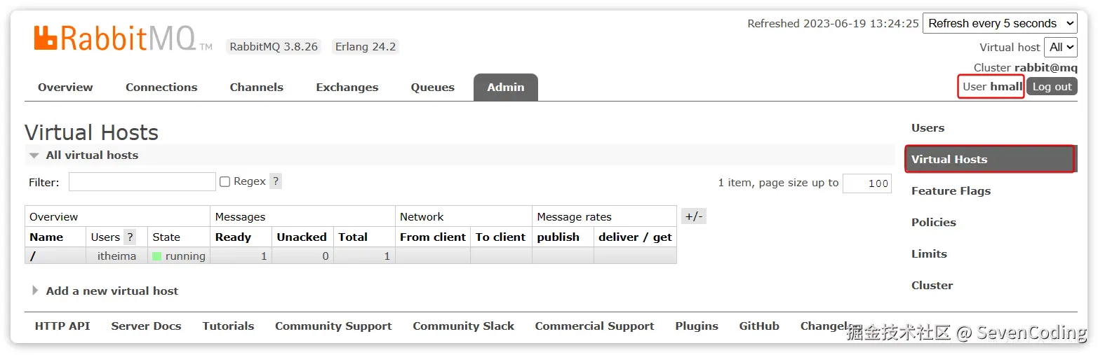 此时,点击页面右上角的virtual host下拉菜单,切换virtual host为 /hmall: