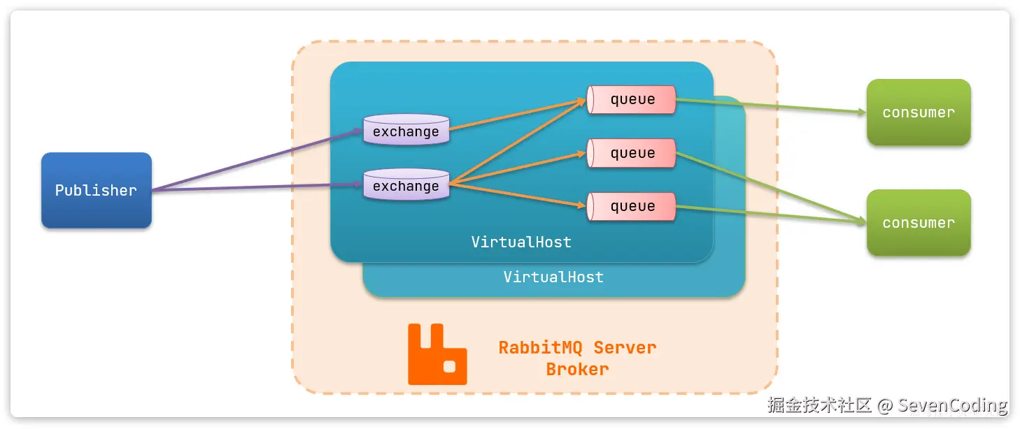 publisher:生产者,也就是发送消息的一方consumer:消费者,也就是消费消息的一方queue:队列,存储消息。生产者投递的消息会暂存在消息队列中,等待消费者处理exchange:交换机,负责消息路由。生产者发送的消息由交换机决定投递到哪个队列。virtual host:虚拟主机,起到数据隔离的作用。每个虚拟主机相互独立,有各自的exchange、queue