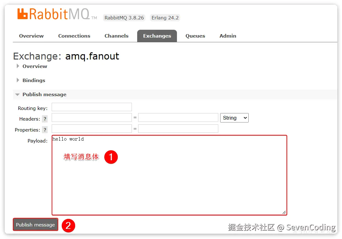 再次回到exchange页面,找到刚刚绑定的amq.fanout,点击进入详情页,再次发送一条消息: