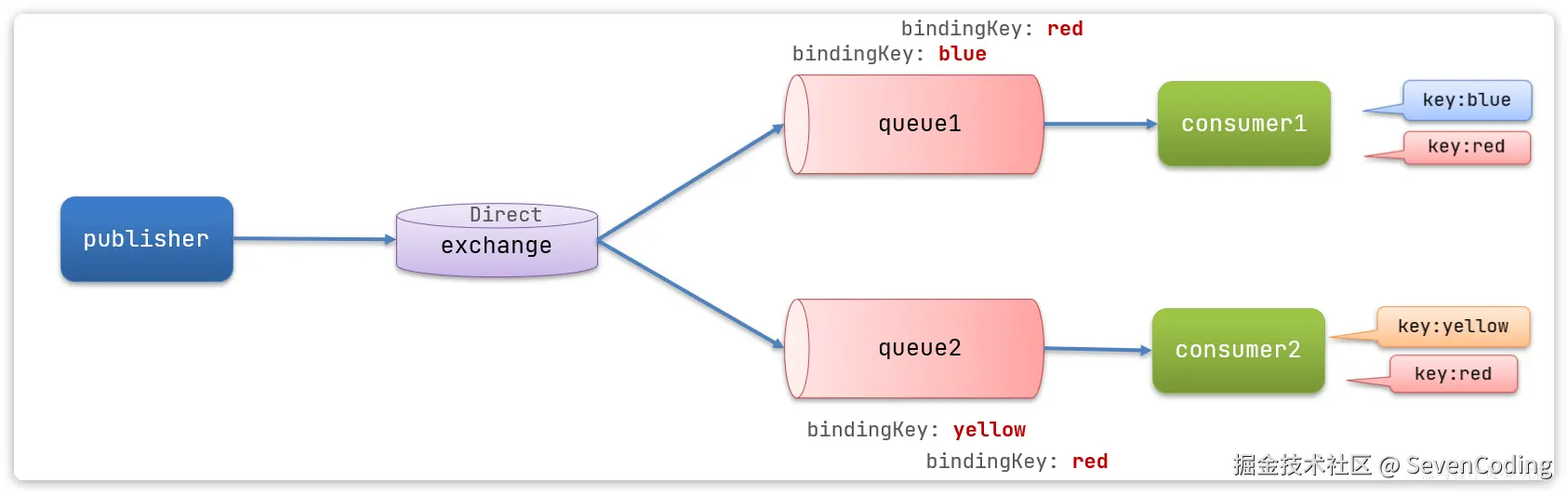 return BindingBuilder.bind(directQueue2).to(directExchange).with("red");