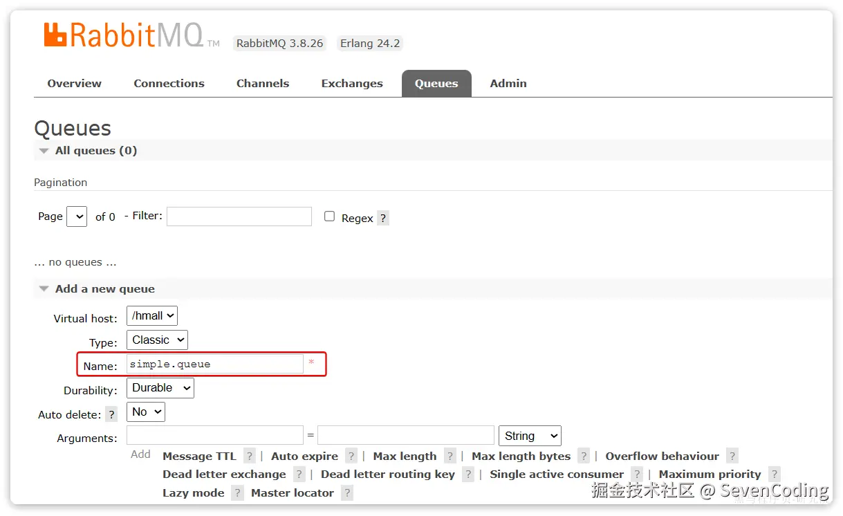 注意,这里我们先不要给这个队列添加消费者,我们要查看消息体的格式。