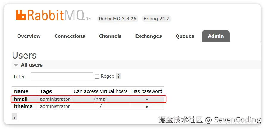 hmall账户后创建的virtual host,因此回到users菜单,你会发现当前用户已经具备了对/hmall这个virtual host的访问权限了:
