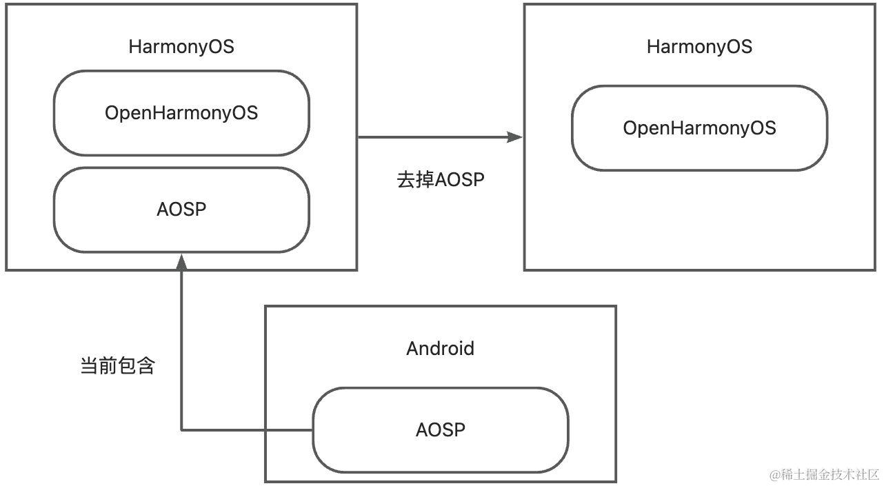 - 当前的HarmonyOS:是基于OpenHarmony和AOSP打造的商用版本的操作系统,现在的搭载鸿蒙操作系统的手机之所以能够运行Android软件就是因为是因为HarmonyOS兼容了AOSP应用。 正是这个原图,目前的华为手机还是可以安装.apk安装包。
