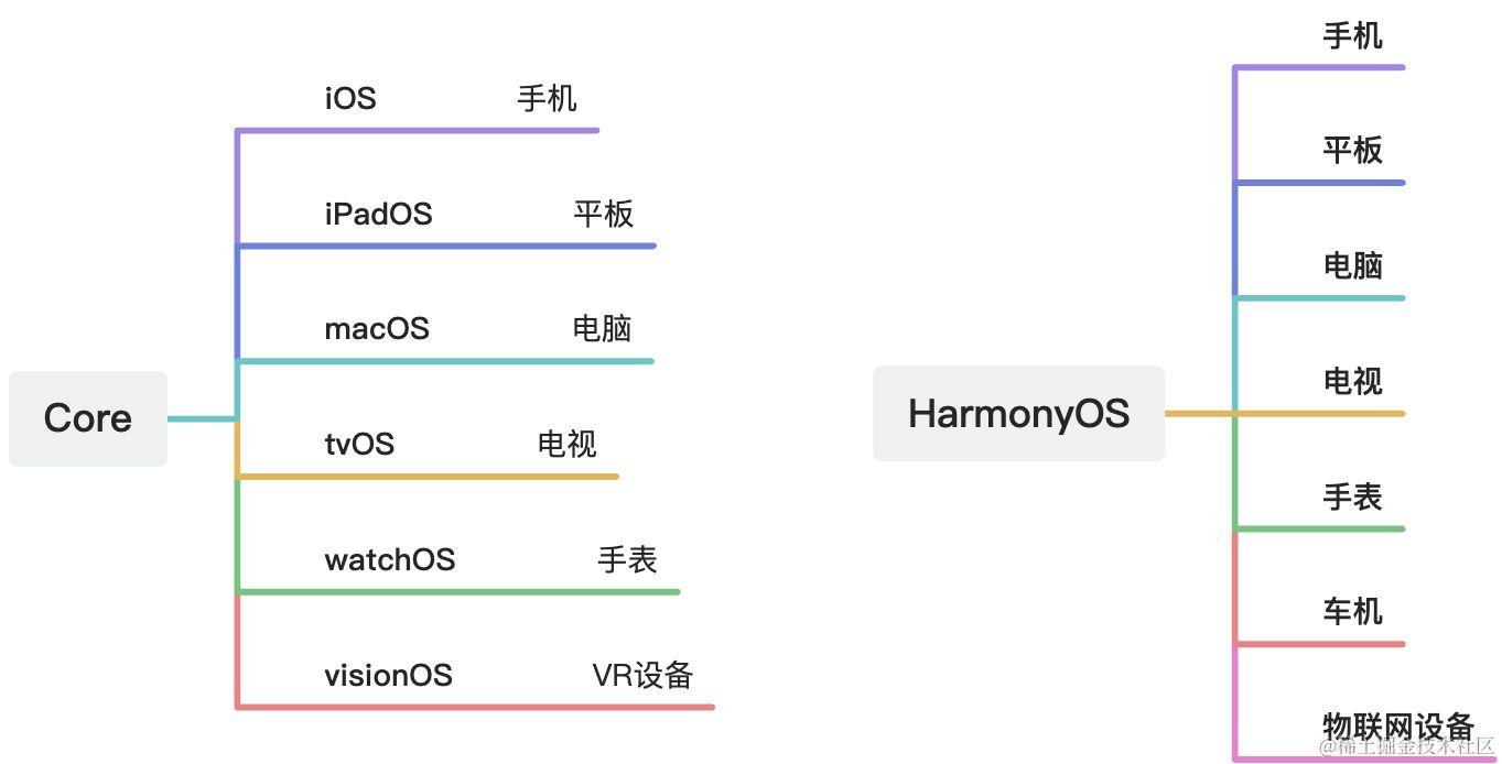 - 苹果的思路是从一个Core里面拉出不同的分支,进而演化成为不同的操作系统,适配和开发不同的设备