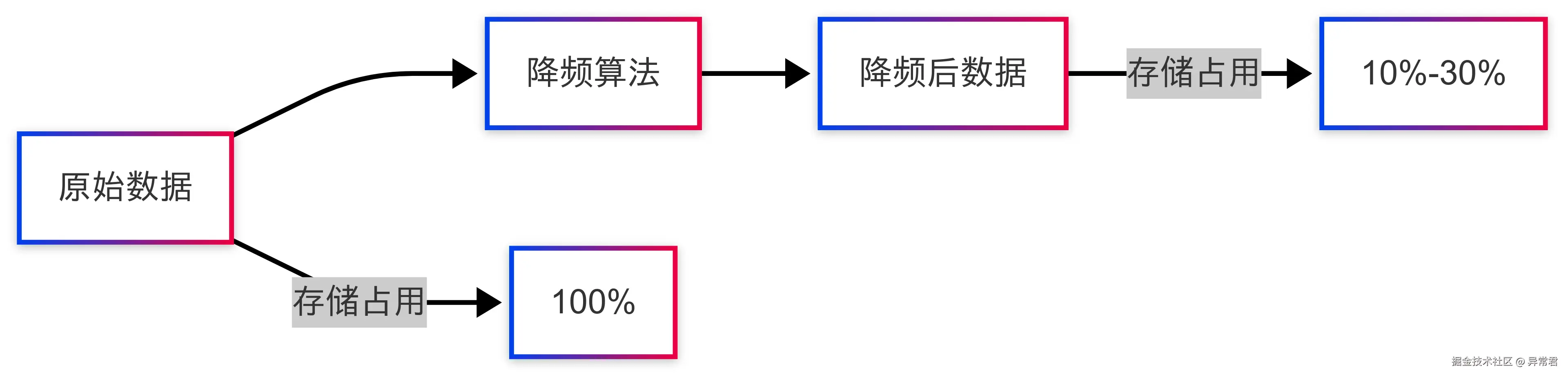 降频存储(Downsampling Storage)是一种数据管理策略,通过降低数据的采样频率或精度,减少存储占用空间,同时保留数据的关键信息和趋势。简单来说,就是"用更少的数据点,近似表示原始数据的变化趋势"。