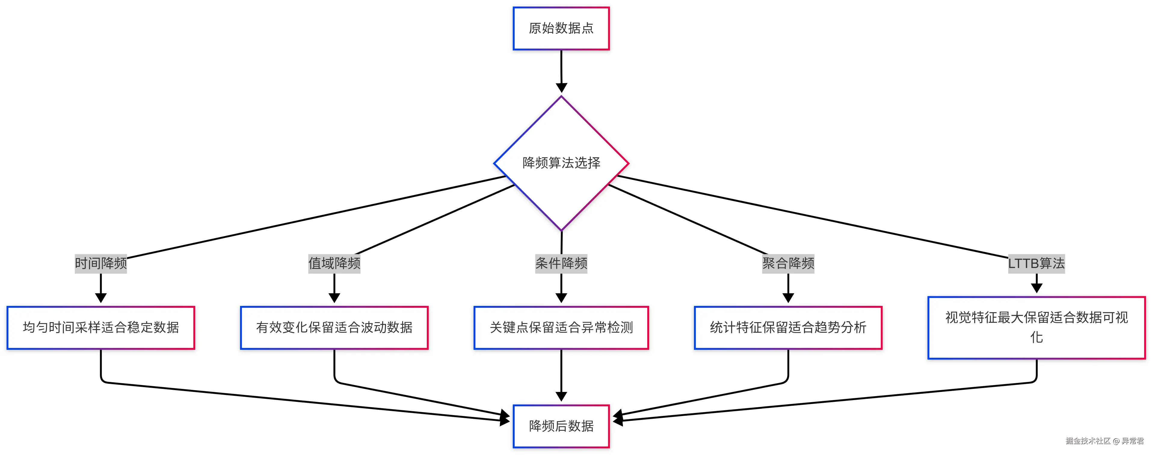 | 主要策略 | 时间维度降频、值域降频、条件降频、聚合降频、LTTB 降频 |