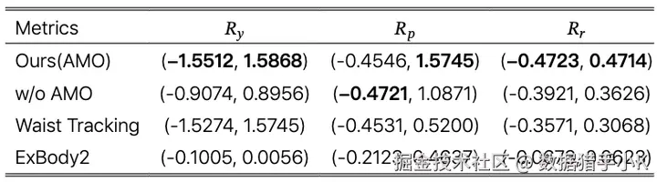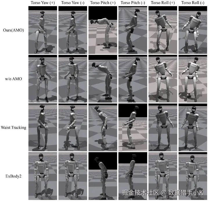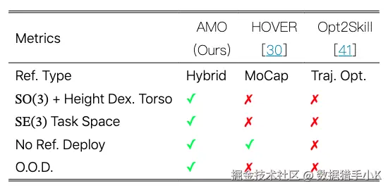 与两种近期代表性的人形运动模仿工作的比较。灵活度躯干表示机器人能否调整其躯干的朝向和高度以扩大工作空间。任务空间表示末端执行器。无参考部署表示机器人在部署过程中是否需要参考运动。O.O.D.表示工作是否评估了 O.O.D.性能,这是机器人由人类操作员控制且控制信号高度不可预测的典型情况。