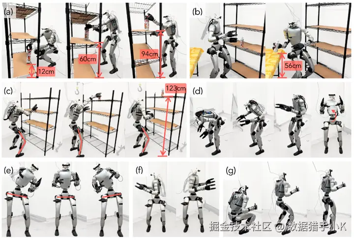4、自主任务执行:通过模仿学习,机器人可以自主完成复杂的全身控制任务,例如在不同高度的平台上进行物体的抓取和放置