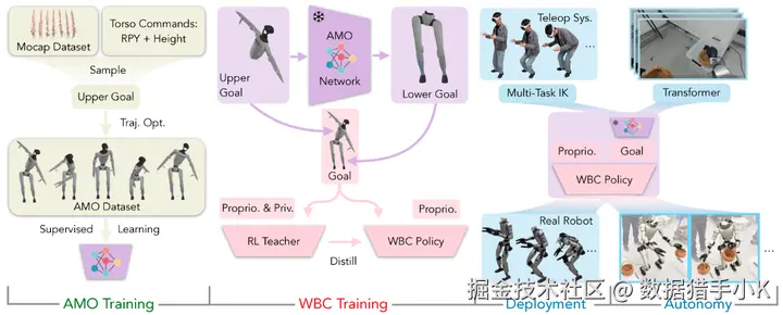 1、混合运动合成:将运动捕捉数据中的手臂轨迹与概率采样的躯干姿态融合,生成上半身命令集。这些命令驱动动力学感知的轨迹优化器,生成全身参考动作。