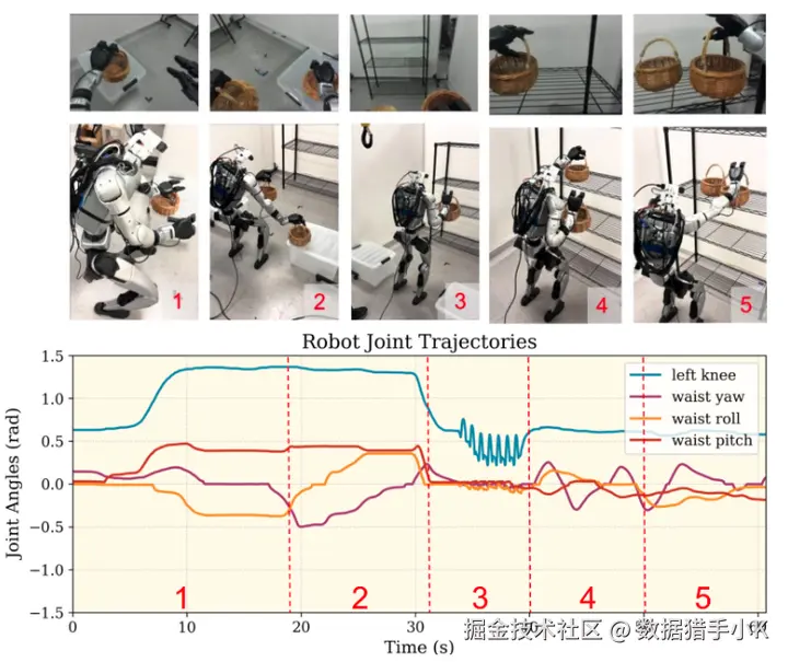 篮子挑选:这是一个复杂的定姿操作任务,同时也需要全身协调。任务开始于机器人从左侧(1)和右侧(2)挑选两个放置在低处且靠近地面的篮子。然后,机器人站立起来,向前移动(3),并将两个篮子放在与眼睛平齐的架子上(4,5)。在自主运行过程中,显示并标注了电机角度轨迹,以匹配相应的阶段。