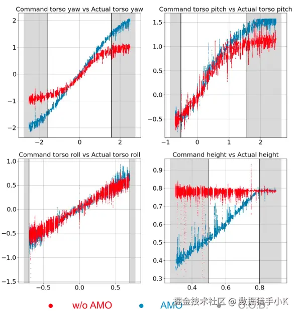 评估分布内(I.D.)和分布外(O.O.D.)跟踪结果。每个图都显示了目标方向与实际指令方向的比较。白色区域表示 I.D.,即指令在轨迹优化和 RL 训练中都使用。灰色区域表示 O.O.D.,即指令在轨迹优化或 RL 训练中都不使用。红色和蓝色曲线分别代表无 AMO 和 AMO 的情况。