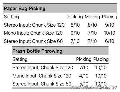 表 IV:每个任务的各个阶段的训练设置和成功率。每个训练设置包括:使用立体(左右眼图像)或单目(单张图像)视觉输入;在动作块分割转换器中使用的块大小。