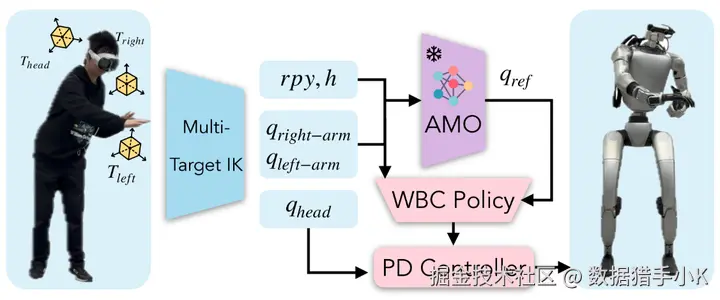 遥操作系统概述。操作员提供三个末端执行器目标:头部、左腕和右腕姿态。多目标逆运动学计算通过同时匹配三个加权目标来得出上层目标和中间目标。中间目标( 𝐫𝐩𝐲,ℎ )被输入到 AMO 并转换为下层目标。
