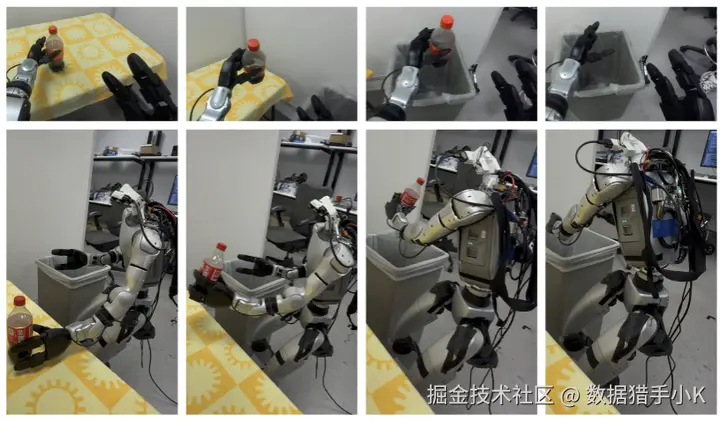 垃圾桶扔掷:任务开始时,机器人弯腰并向左转动上半身以抓取垃圾桶。然后,机器人将腰部向右转动约 90 度,将垃圾桶扔进垃圾桶内。