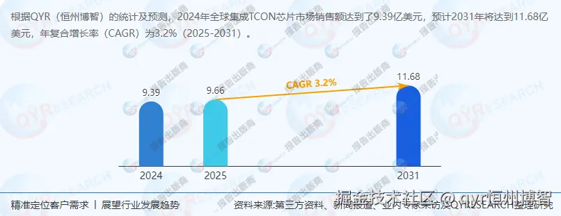 根据QYR(恒州博智)的统计及预测,2024年全球集成TCON芯片市场销售额达到了9.39亿美元,预计2031年将达到11.68亿美元,年复合增长率(CAGR)为3.2%(2025-2031)。这表明全球集成TCON芯片市场在未来几年将保持稳定增长态势。