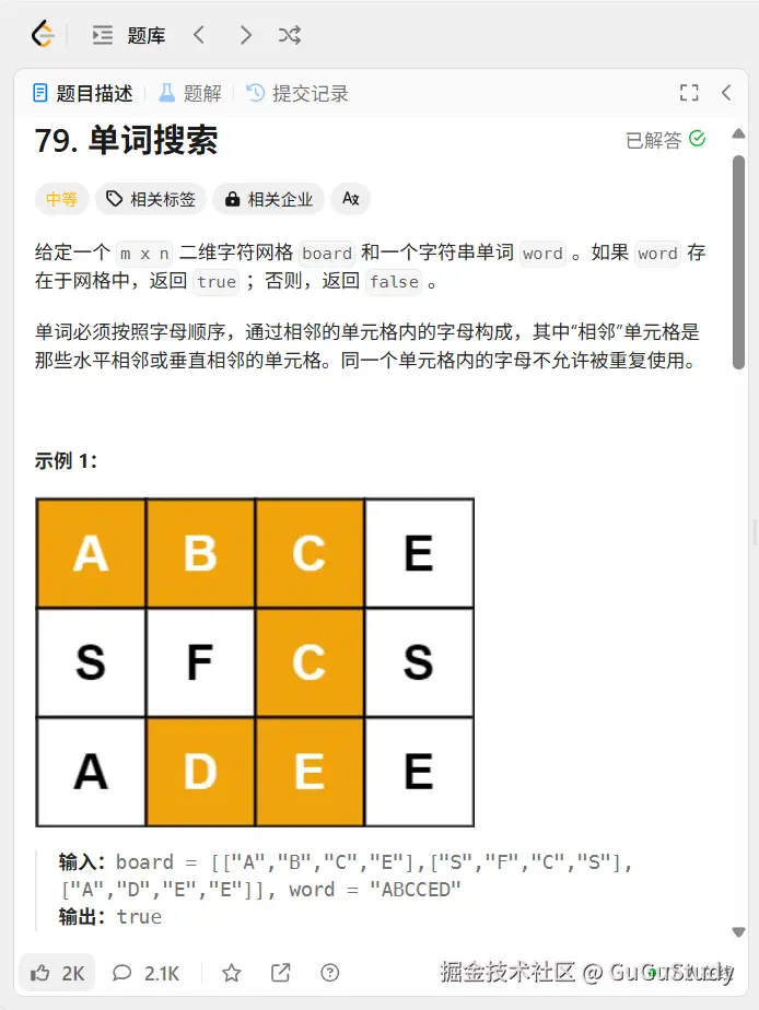 这里就是简单的dfs,上下左右,开始寻找下一个单词字母,如果这个位置选了字母但是下面继续递归返回的结果是false,那么我们就回溯,寻找其它三个方位是否存在要找的单词。