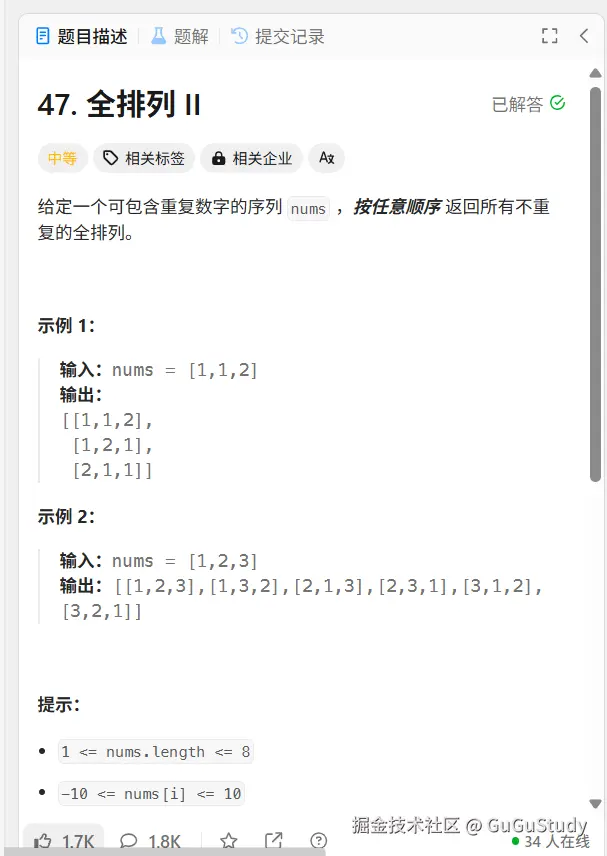 这一题与上一题不同的是,这一题是有重复元素的,而答案要求不能有重复的全排列。这与上一题不同的就是我们需要对相同的全排列去重。
