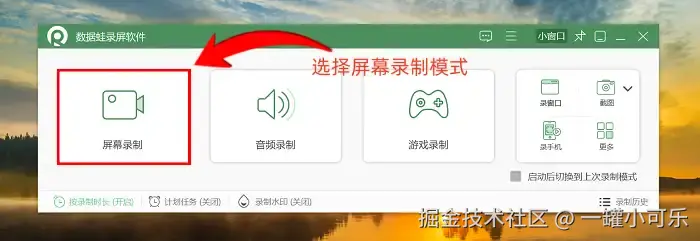 步骤1:电脑屏幕录制怎么弄?首先在你的电脑上找到并打开软件,接着你会看到视频、音频、游戏等好几种基础录制模式。一般情况下,咱们直接选择 “屏幕录制” 模式,就能满足大多数屏幕录制的需求啦。