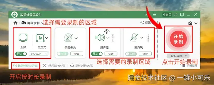 步骤2:接着就可以在 “屏幕录制” 模式的界面上,去选择录制的视频区域和音频源啦。需要录制内部音频就打开 “扬声器” ;需要录制外部音频就打开 “麦克风” 。我们还可以在软件页面下方点击打开 “按时长录制” 任务。全部搞定后,就可以点击 “开始录制” 按钮开始录屏了。