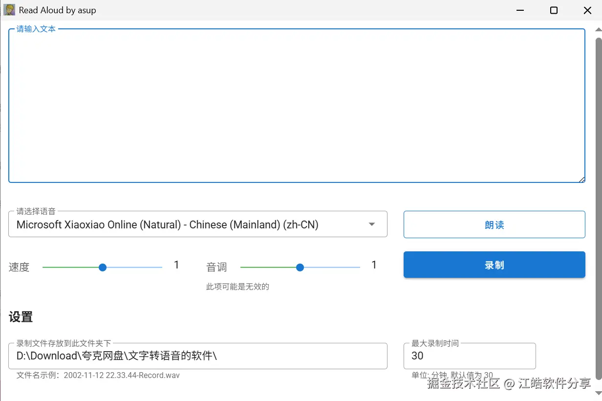 一键生成语音:输入文字即可自动朗读,并支持 录制保存为音频文件(需等待朗读完成)。