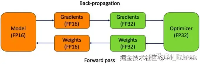 混合精度训练的大致思路是在 forward pass 和 gradient computation 的时候使用 fp16 来加速,但是在更新参数时使用 fp32。