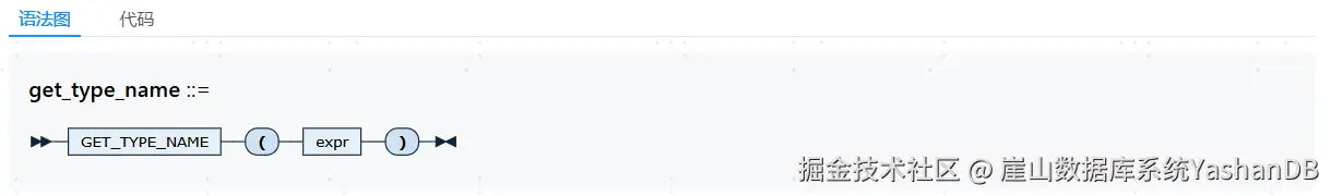 GET_TYPE_NAME函数将expr作为数据类型ID,用于查询类型的名称,并将结果作为VARCHAR类型的字符串返回。
