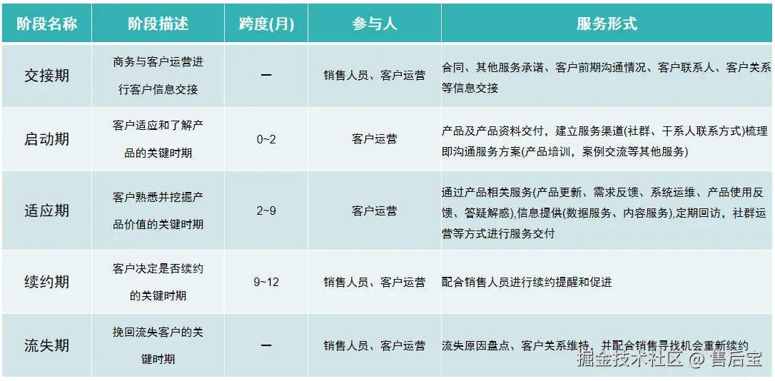 不论是To C还是To B的客户都是分阶段的,例如To B场景的客户阶段分为交接期、启动期、适应期、续约期、流失期,在不同阶段企业能为客户创造的价值是不一样的,因此要制定不同的运营措施,服务部门尤其要关注适应期、续约期;To C场景的客户阶段分为接触、兴趣、购买、复购、忠诚,同样要考虑不同阶段的客户运营重点,通过服务与运营,匹配客户在每个阶段的最大利益诉求。