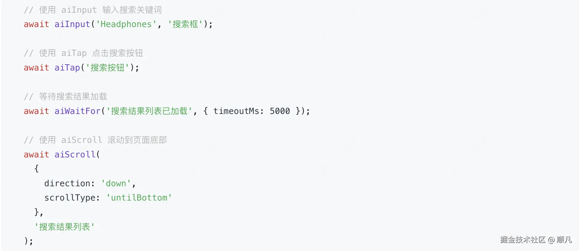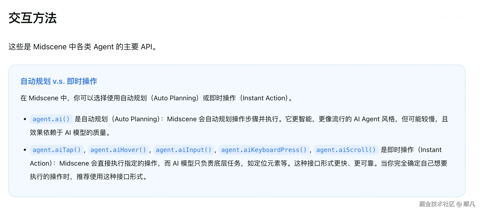 如上图官方的 playwright 示例 所示,Midscene 将复杂的自动化流程分解为一系列精确的微操作指令(如 aiAction、aiQuery、aiTap、aiInput等),官方文档将这些 API分为两类:
