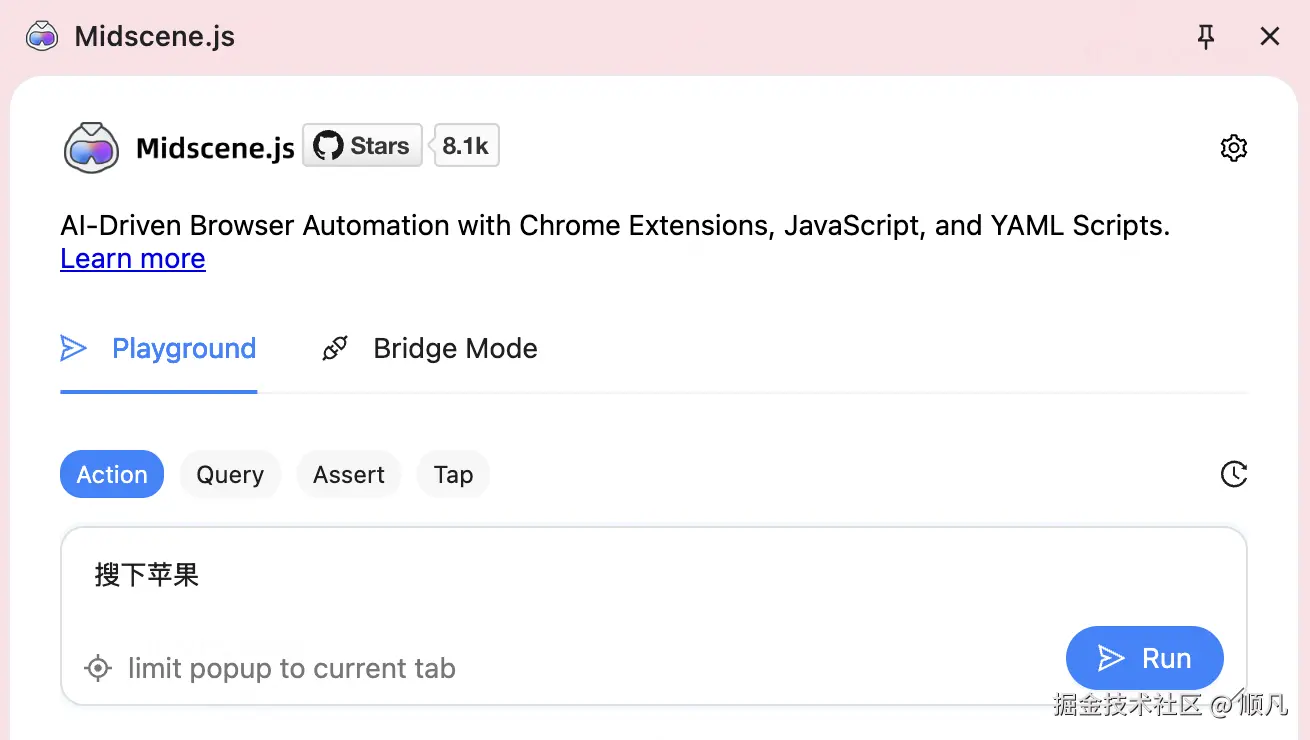Midscene 提供 Chrome 插件形式,在开始使用的时候,我没有仔细阅读 Midscene 官方文档,以为 Chrome 插件就是 Midscene 的核心,脑子就在想这个东西怎么做自动化测试,还那么多 star,后面使用和阅读文档后,才知道 Chrome 插件只是让用户快速体验核心功能入口,惭愧惭愧。