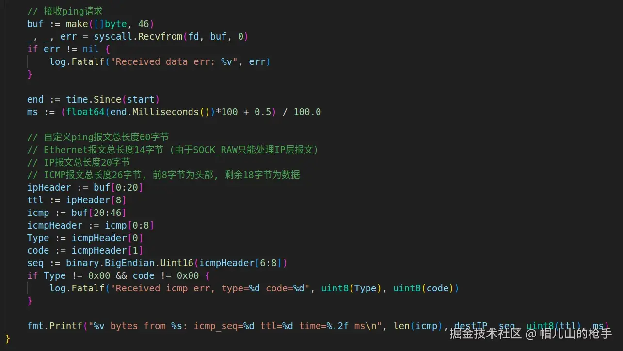下面代码用于接收ping响应报文, buf 变量接收长度为46,是因为我们发送时定义的报文大小是46,所以服务端也会将按照这个大小返回响应。