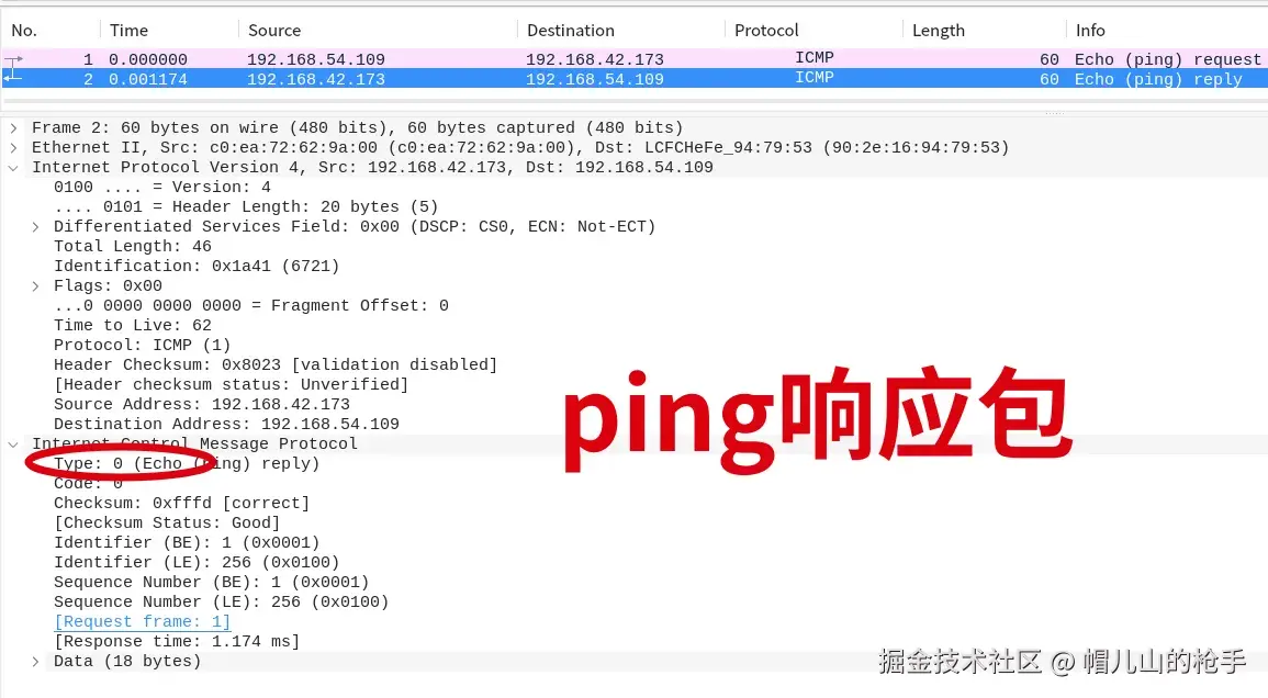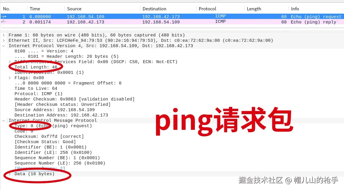 这里需要注意的是,自定义封装的ping数据包总长度为60字节。 分别为以太帧14字节、IP头部20字节、ICMP报文26字节。