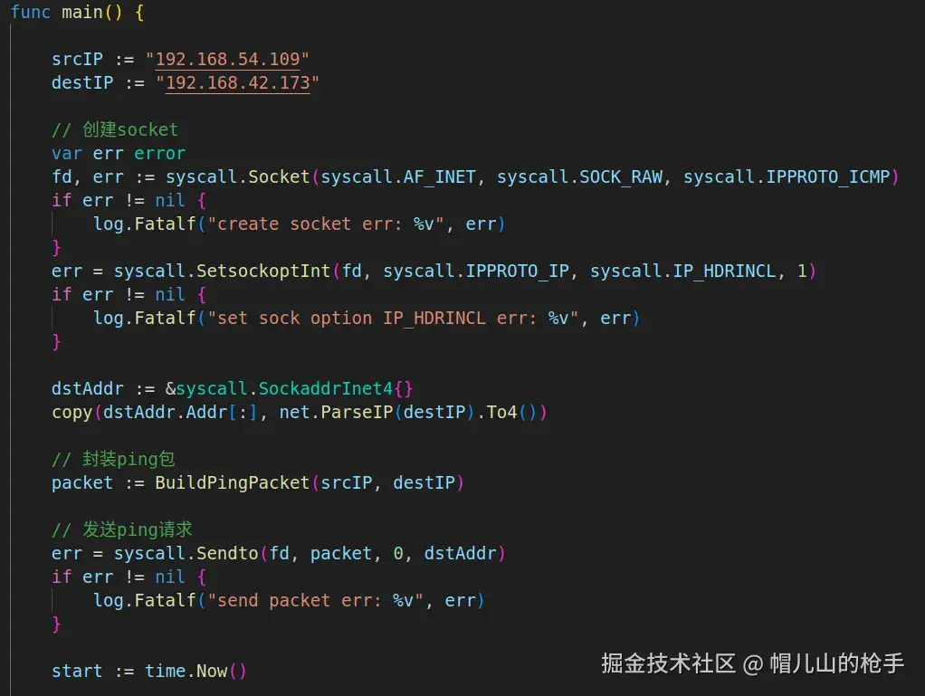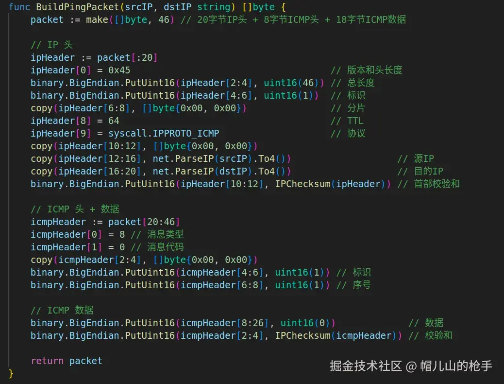 ping 192.168.42.173命令,然后通过tcpdump -i 网卡名称 icmp抓包; - 拿到数据包格式内容后,按照IP协议、ICMP协议格式进行组包;