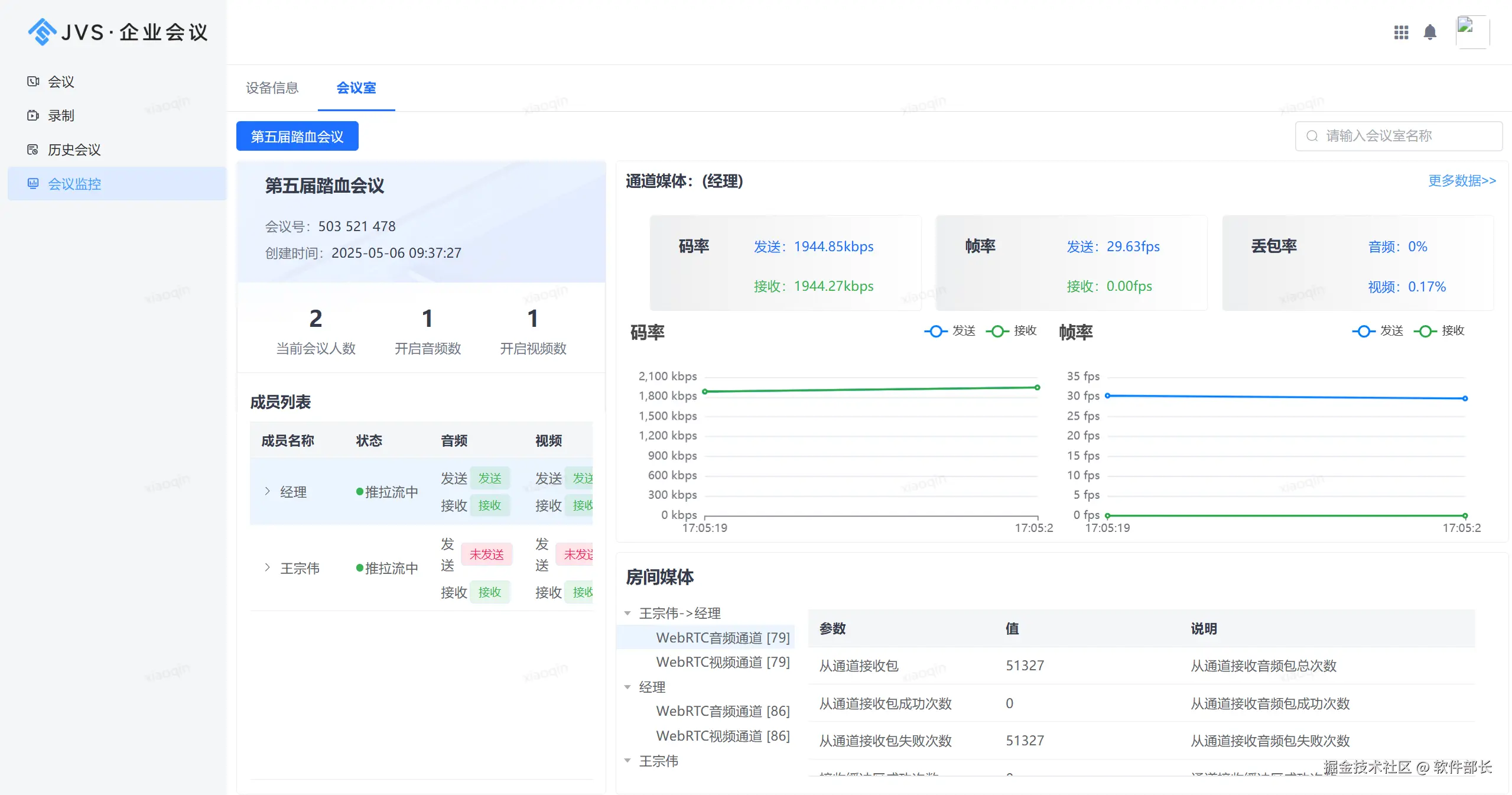 - 混合会议模式:支持SIP/H.323传统设备与WebRTC终端互联