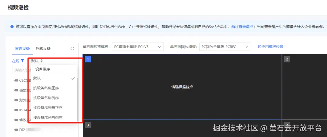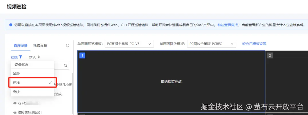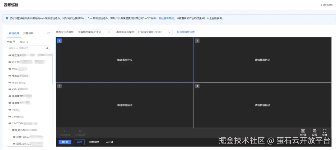 随着各行业精细化管理的提升,音视频单屏功能已无法满足高效管理的需要,多屏多画面应用需求持续增多,尤其在连锁、工地、监管等巡检功能高频使用的场景。萤石开放平台在单屏无插件取流巡检组件基础上,升级新功能,便捷支持多屏预览与回放,开发者可一键集成,快速完成行业应用部署。