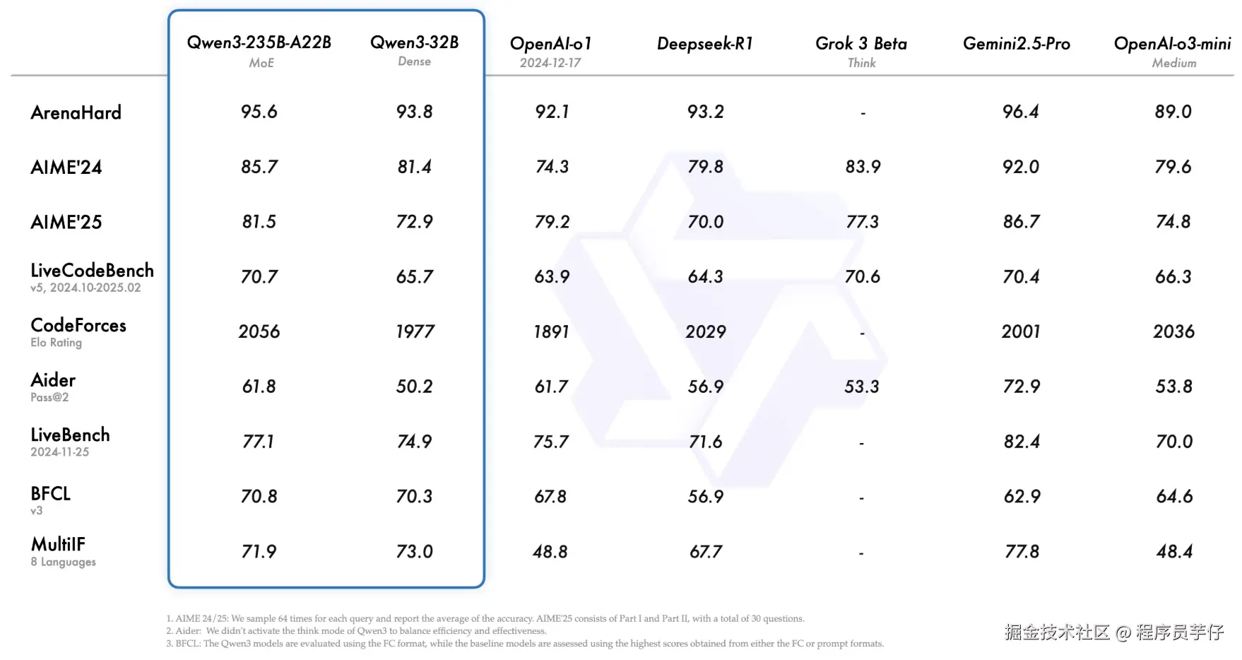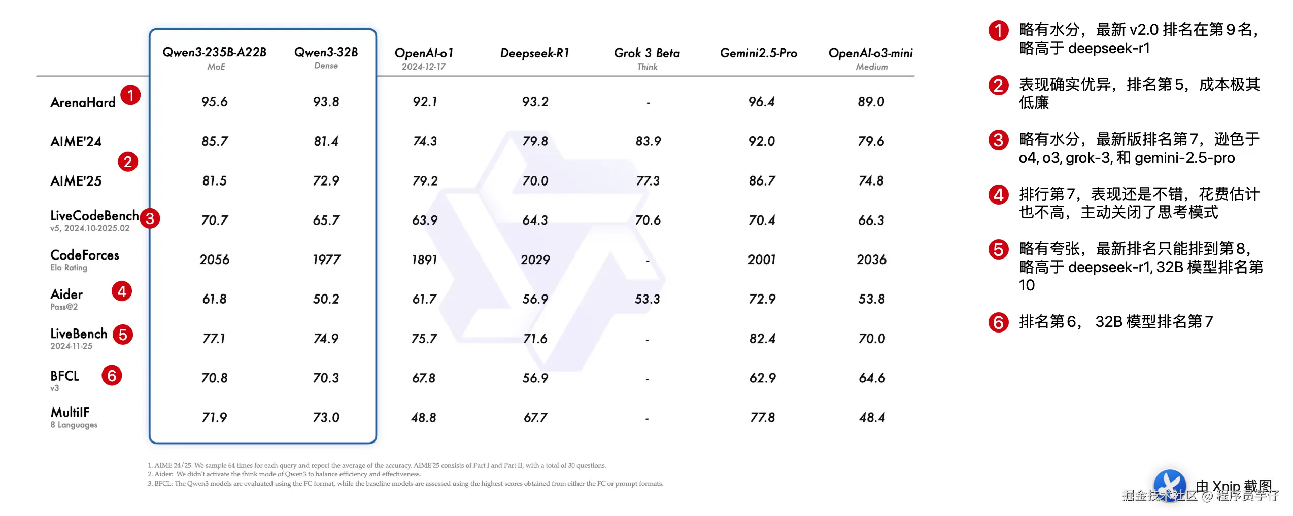 而 Qwen3 官方也是把最优秀的数字放在了开头:ArenaHard (构建复杂的提示词让模型回答后,由 AI 评判打分)。