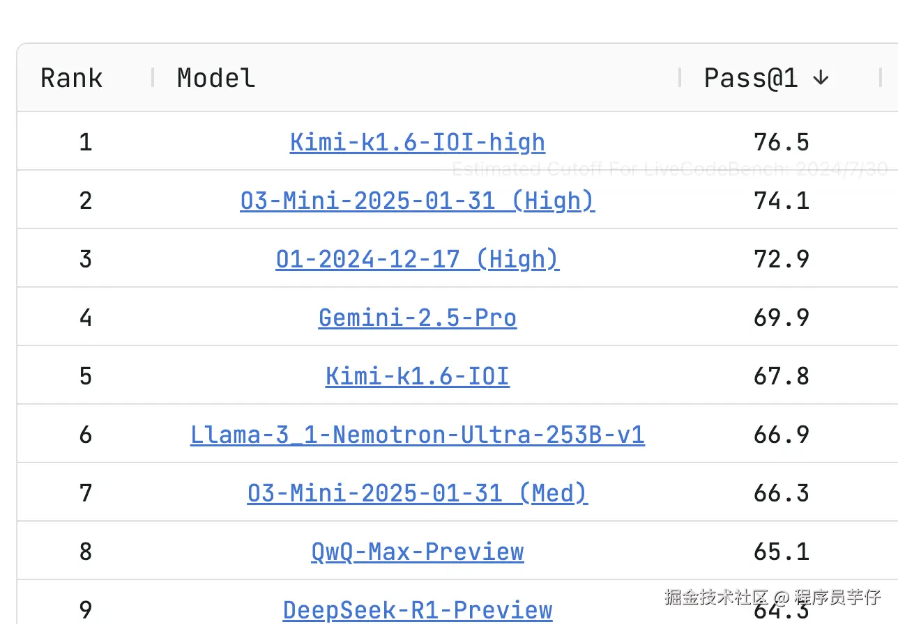 LiveCodeBench (做算法题):最新版排名第7。