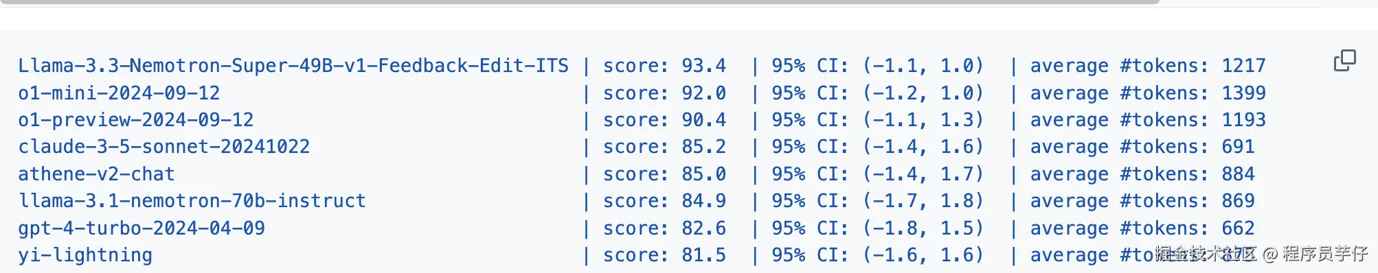 从 ArenaHard v0.1 的官方数据来看(如下图),顶尖模型的得分基本就在 86 ~ 92 分,略有饱和的趋势,95.6 绝对第一名。