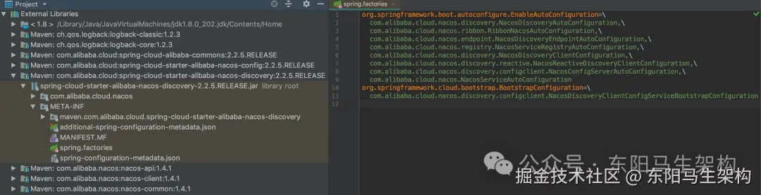 spring-cloud-starter-alibaba-nacos-discovery依赖包会自动注册服务。查看这个依赖包中的spring.factories文件,会指定一些Configuration类。Spring Boot启动时会扫描spring.factories文件,然后创建里面的配置类。