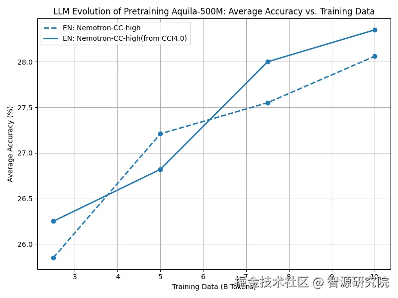 如图1所示,针对相同的英文网页原始语料(Nemotron-CC-high),CCI 4.0设计了基于loss过滤操作的有效性验证实验,通过使用过滤前与过滤后(Nemotron-CC-high from CCI4.0)的英文语料分别训练模型,再进一步对比模型在下游任务上的平均性能表示。结果显示,在训练过程中基于loss过滤的英文语料可在训练过程中提升模型的训练效率。