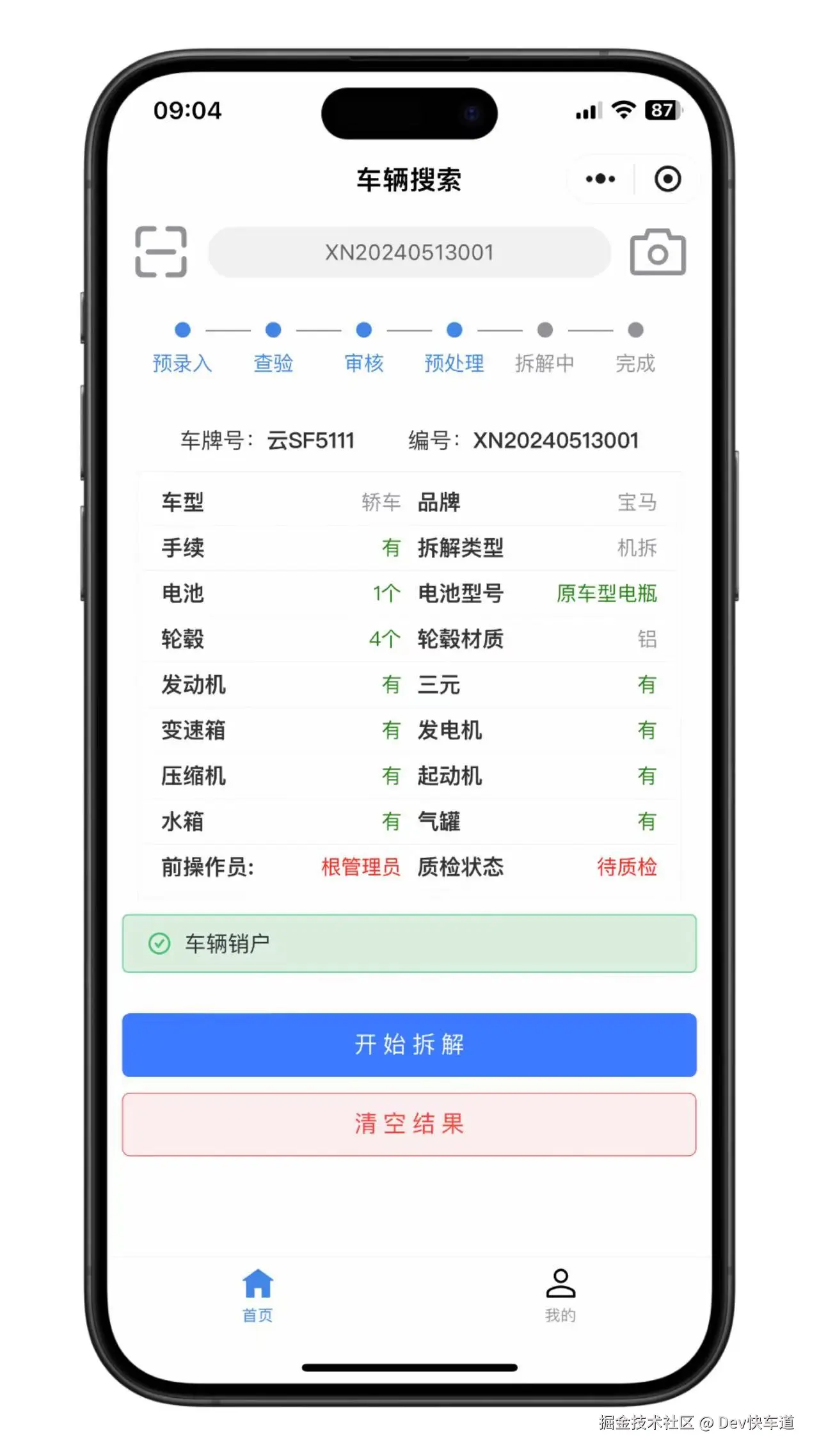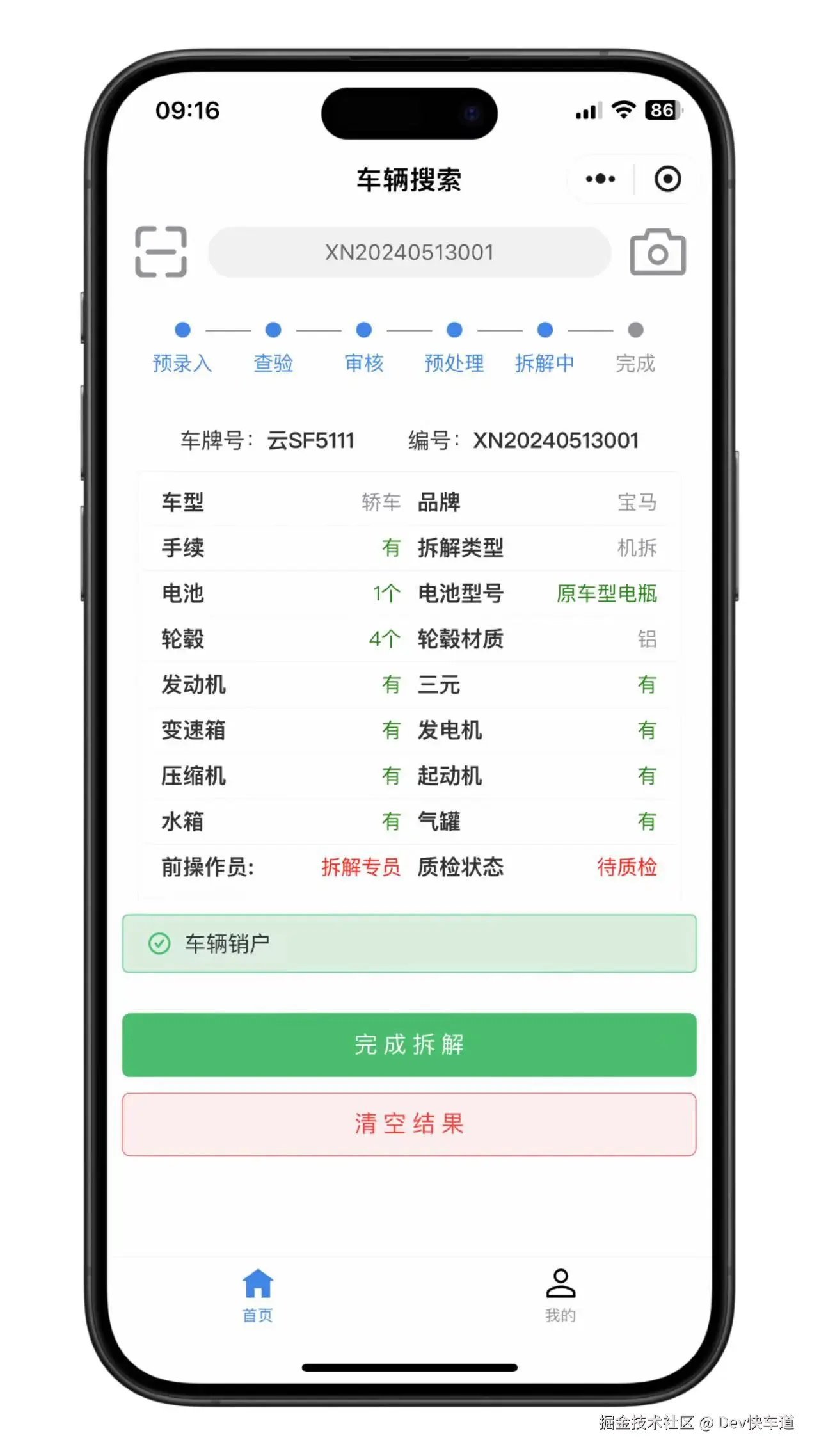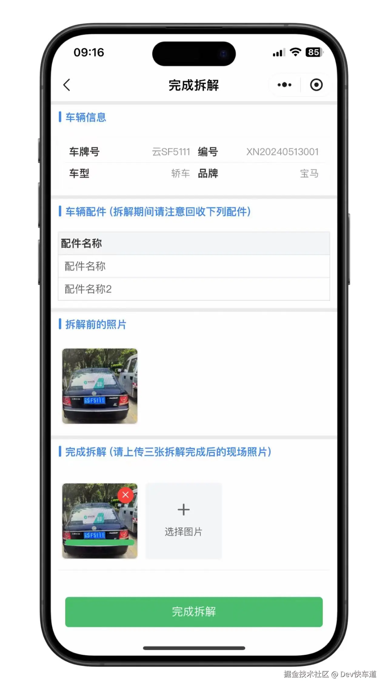 如下图所示,首先是搜索车辆信息,在现场一般采用扫码二维码的方式,接下来是查看车辆信息,看是否有相关操作按钮,如果有完成拆解按钮,则点击完成拆解; 在完成拆解界面中,需要提交拆解后的现场照片;另外,系统还会显示此车辆拆解配件的情况;