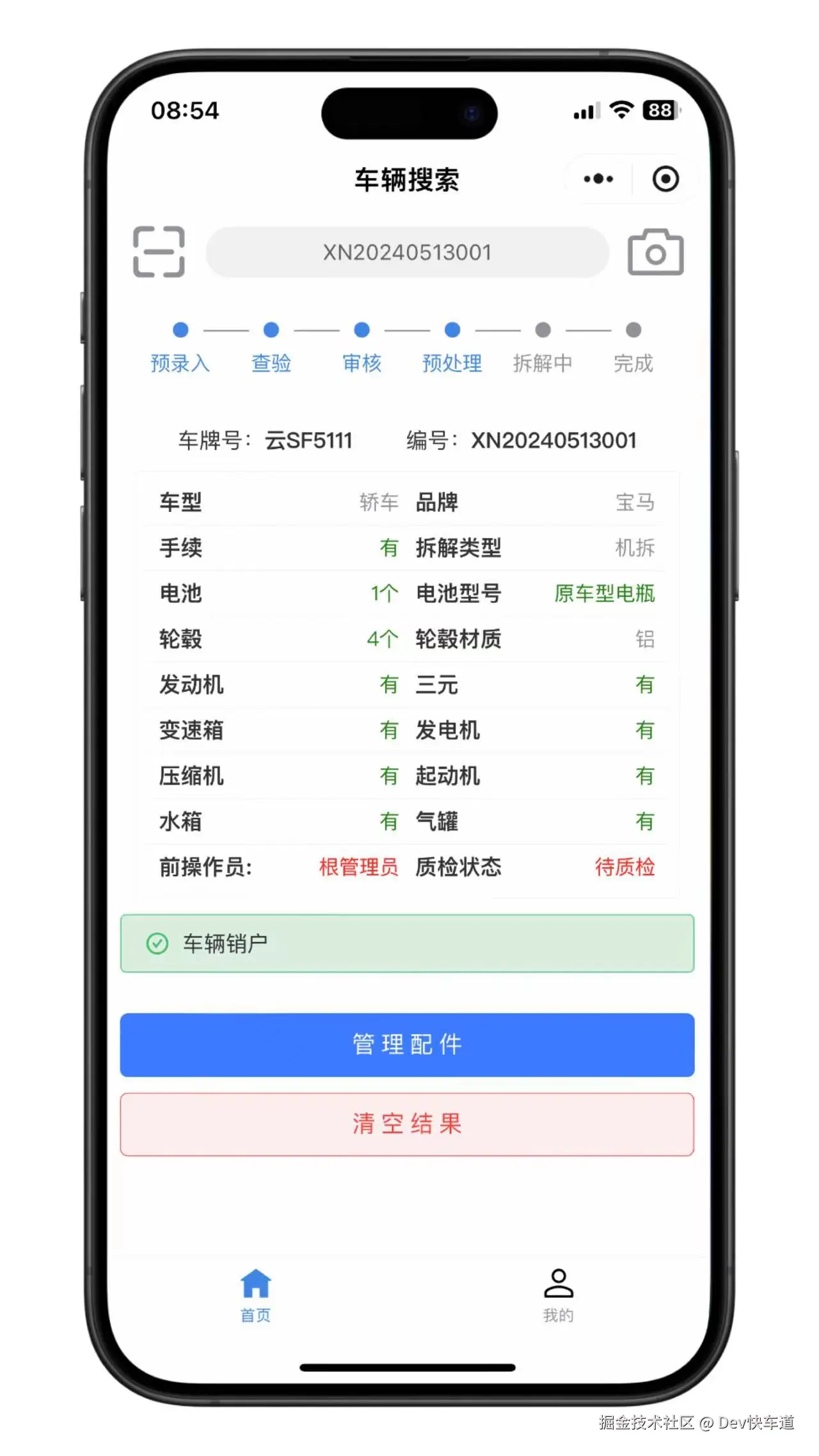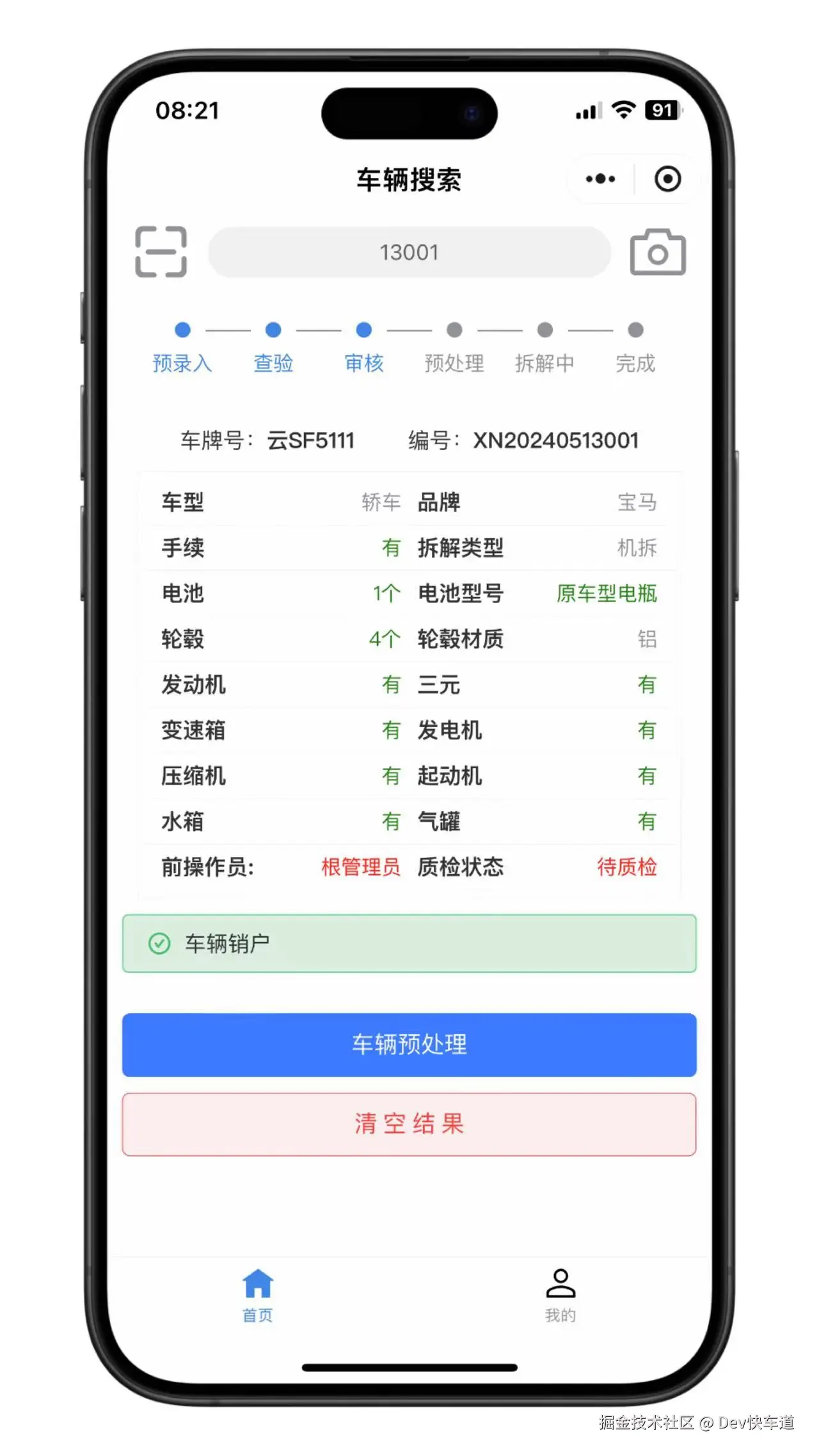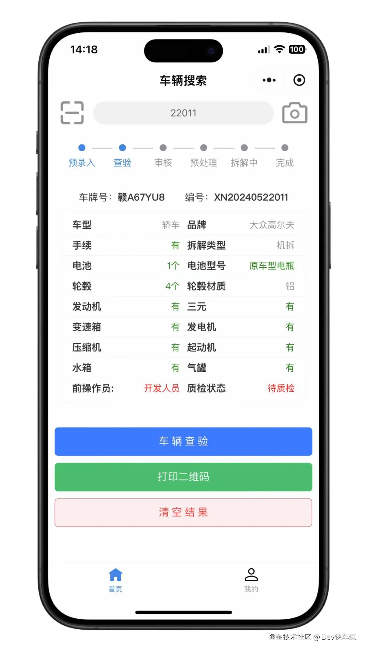 如下图所示,首先是搜索车辆信息,在现场一般采用扫码二维码的方式,接下来是查看车辆信息,看是否有相关操作按钮,如果有完成拆解按钮,则点击完成拆解; 在完成拆解界面中,需要提交拆解后的现场照片;另外,系统还会显示此车辆拆解配件的情况;