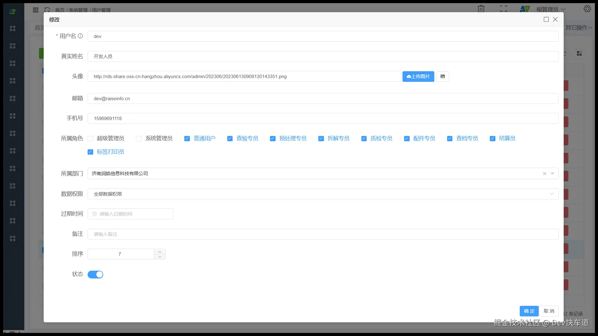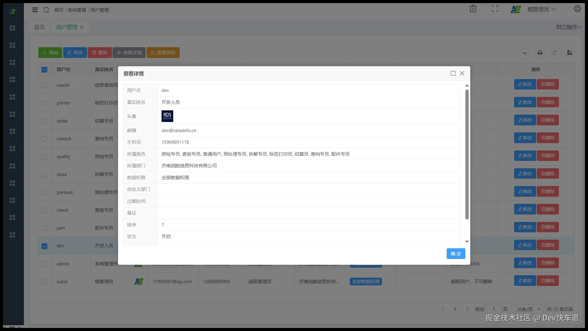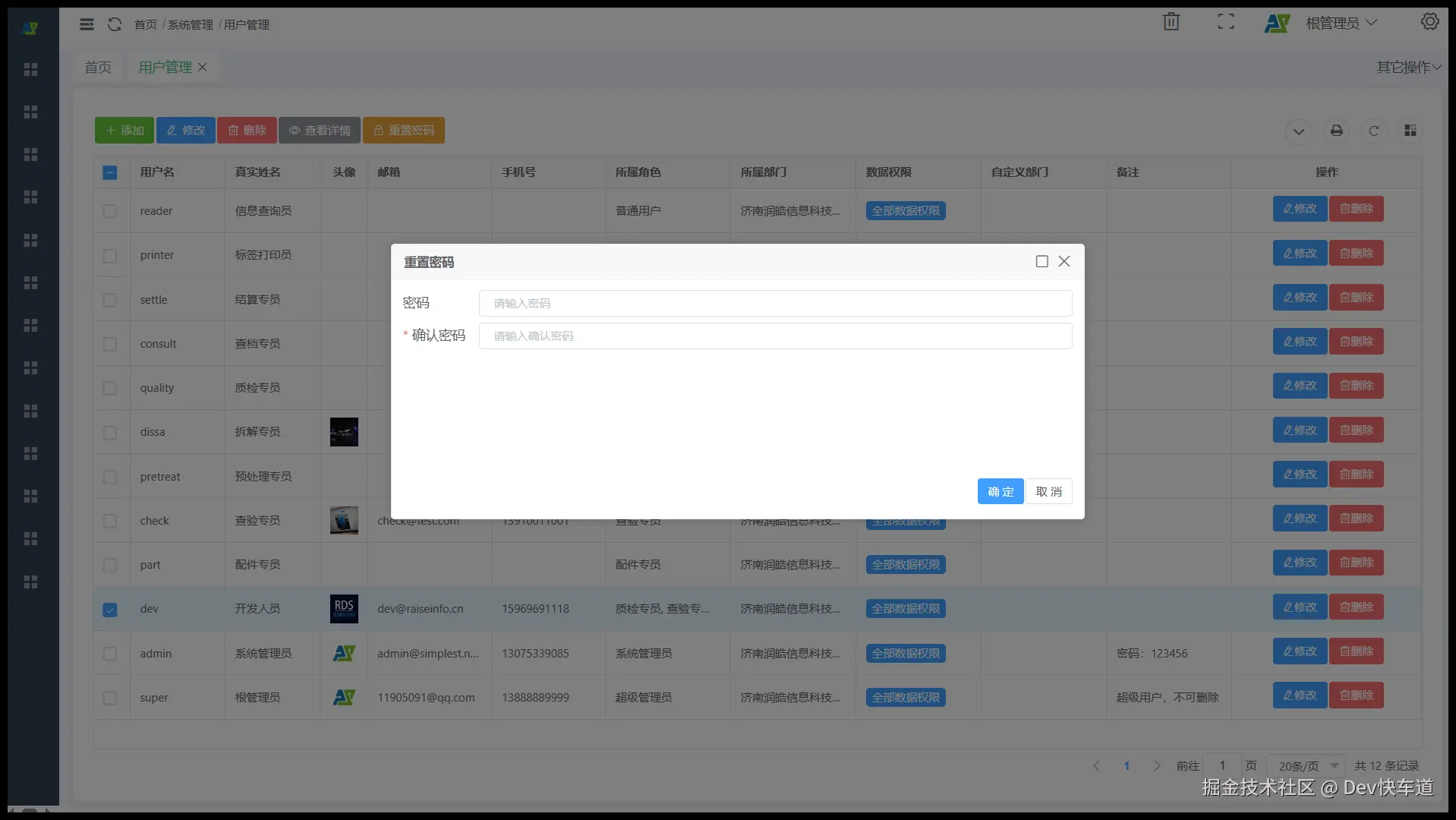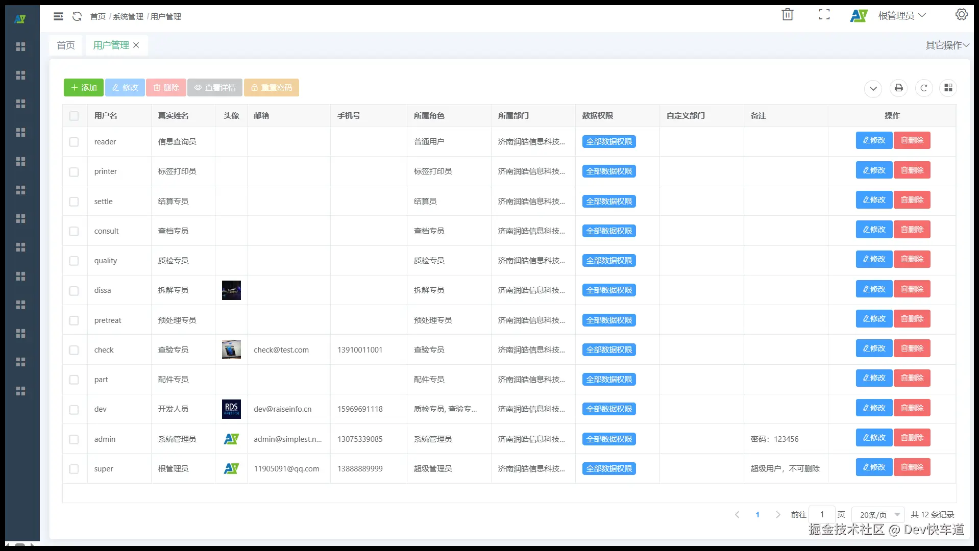 用户管理用于配置登录系统的用户,主要配置项有用户名、密码、真实姓名、头像、手机号、邮箱、所属角色等; 所属角色在角色管理中管理,他用来决定用户可以使用哪些菜单和按钮;用户名、手机号、邮箱都可以作为登录 的用户名进行登录,具体请查看系统中的具体实现;管理用户主要常用的选项是配置角色、修改密码等操作,请 用户自行学习使用;