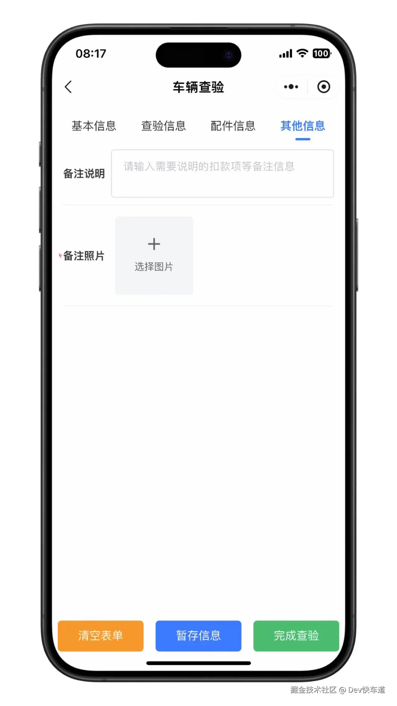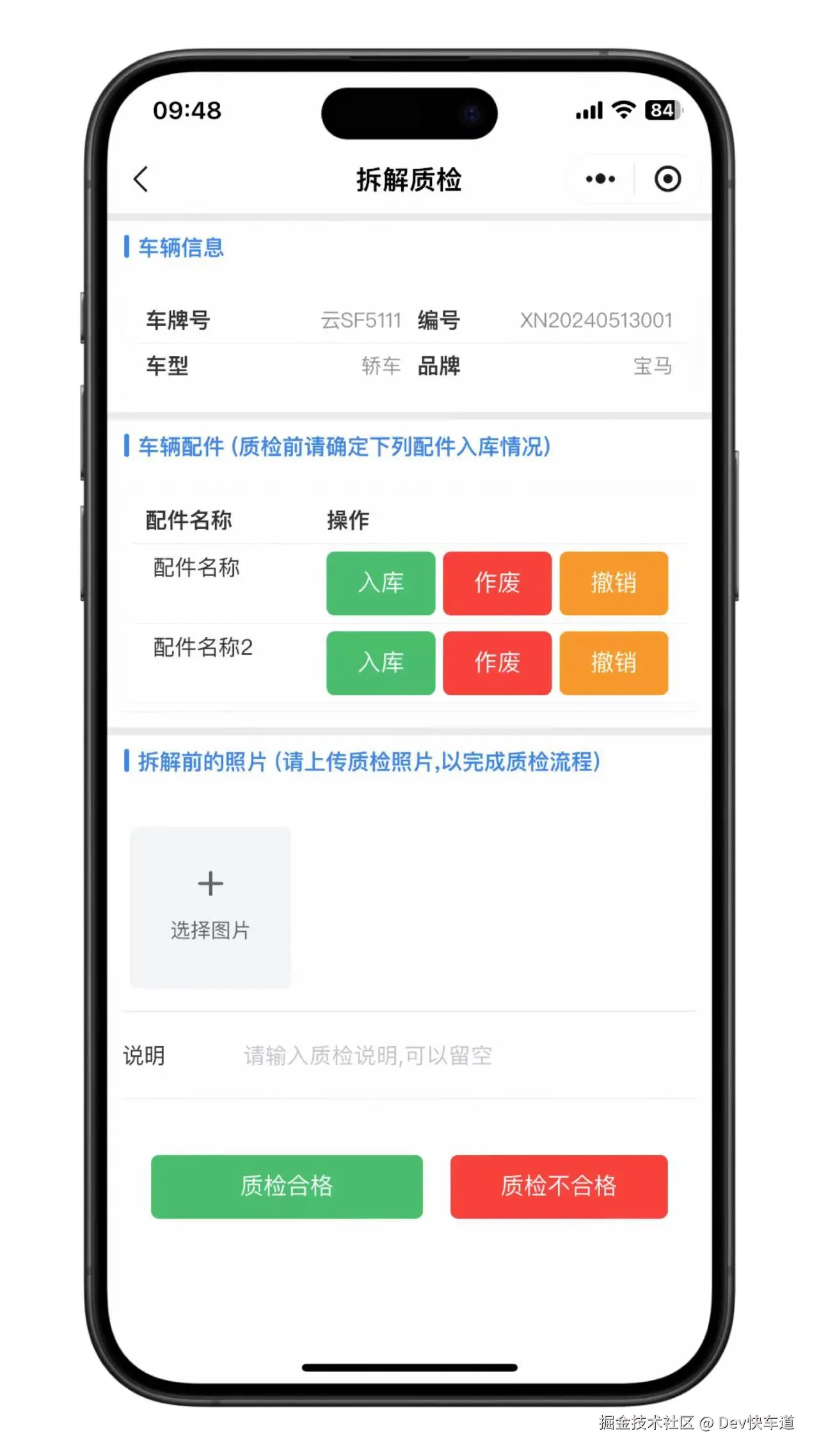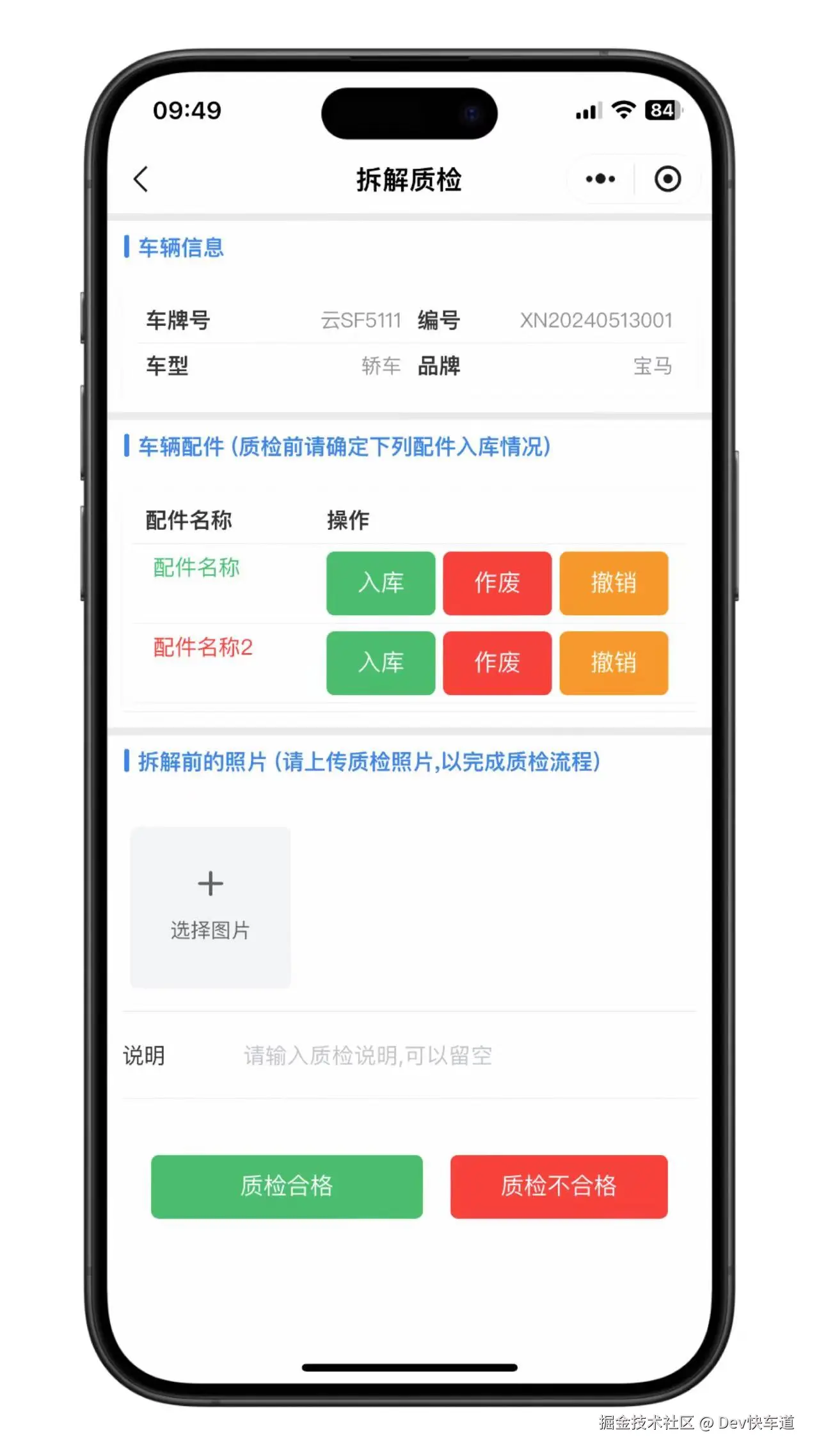 - 上传质检照片:质检人员可以对当前车辆的拆解现场进行拍照,如果拆解有问题,可以录入说明信息;