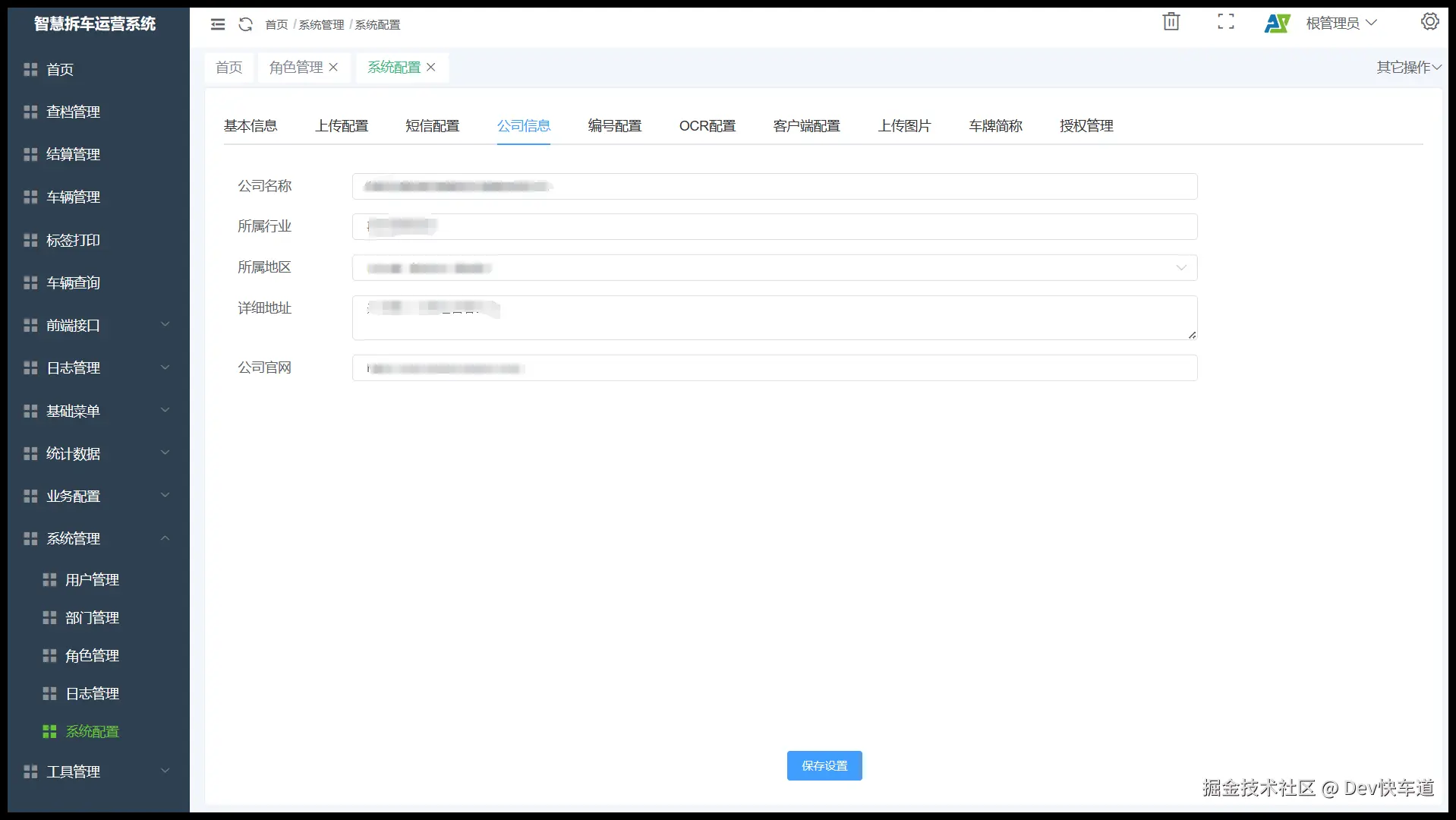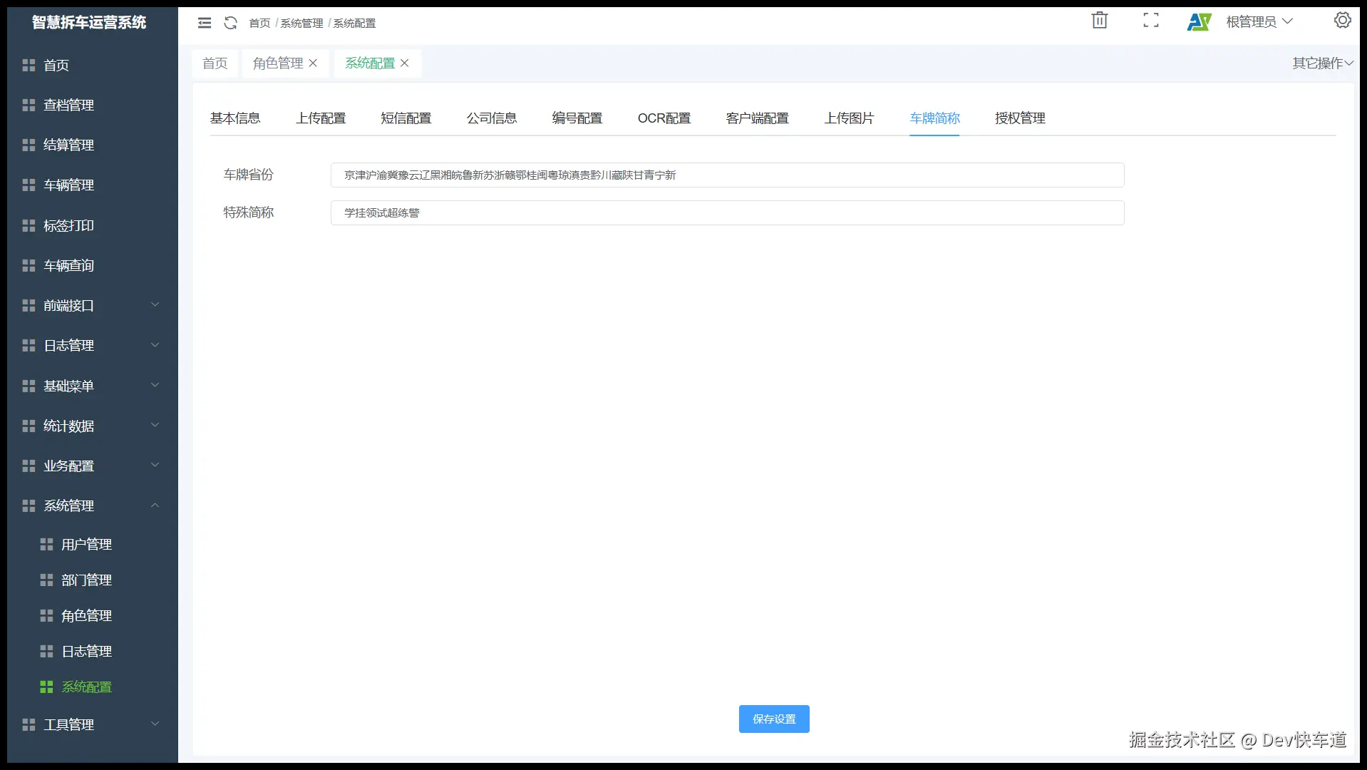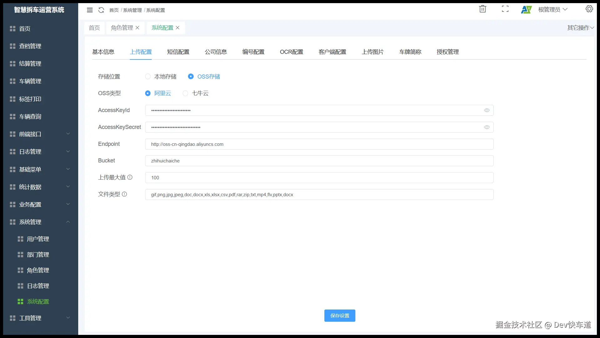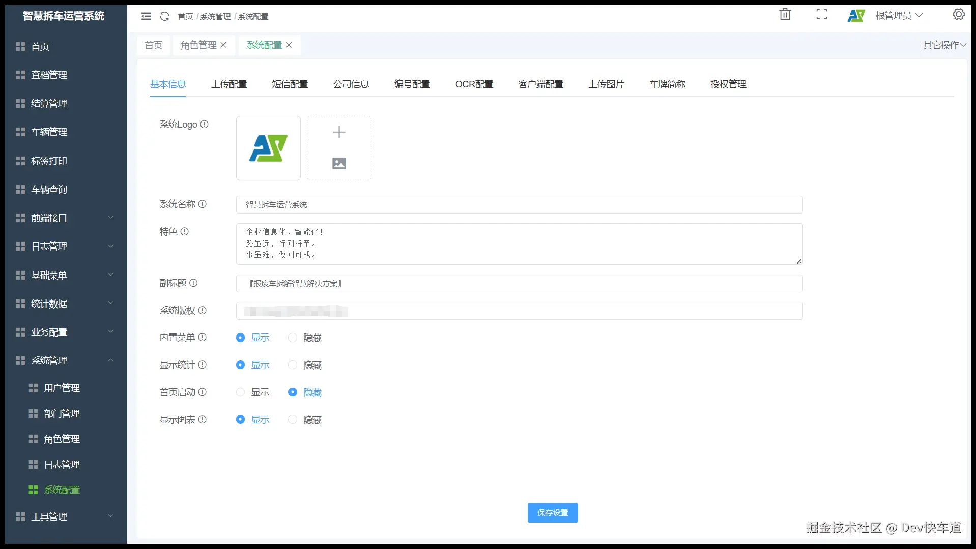 在我们的管理系统和业务系统中,会有很多需要配置的选项,诸如系统名称,上传规则,OCR接口配置等;我们通过系统配置 菜单,可以配置系统基本信息,上传、短信、公司、OCR、小程序端配置等;