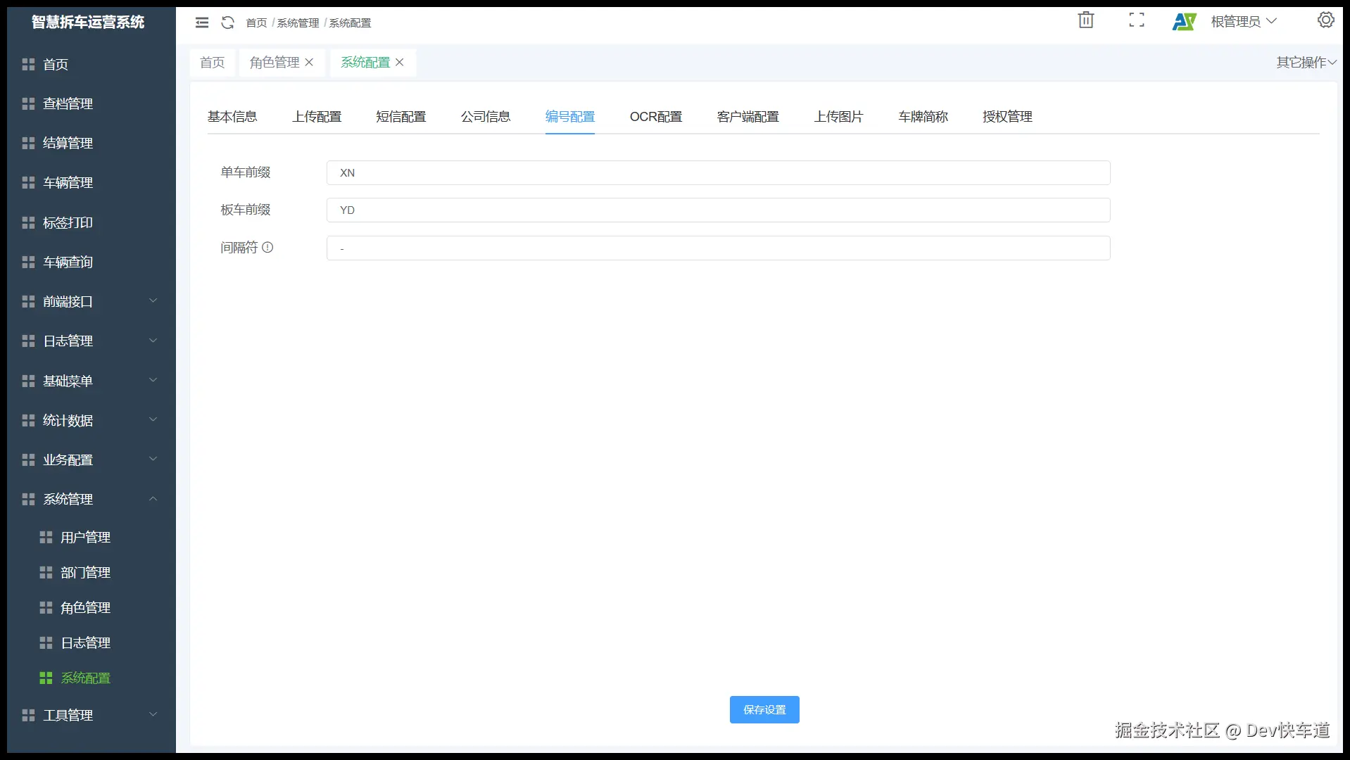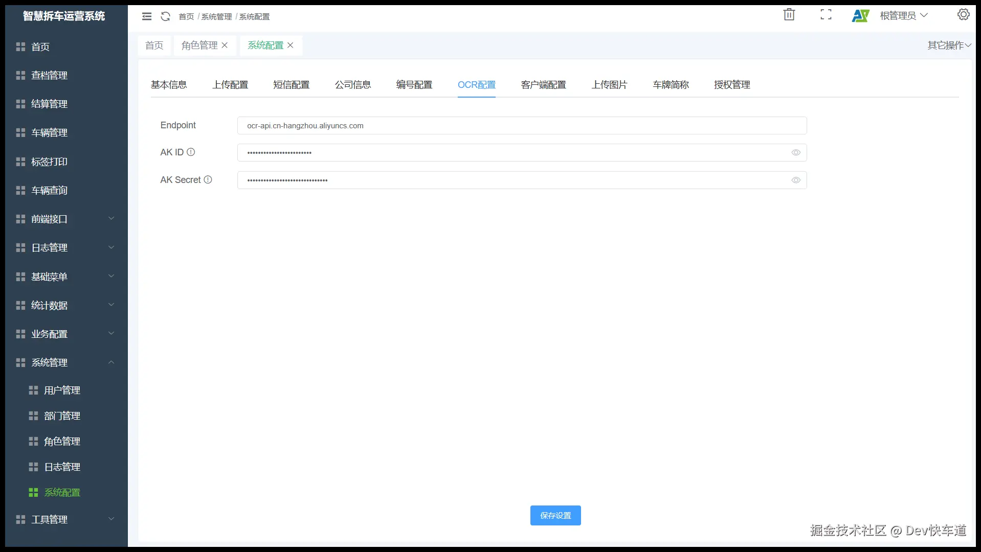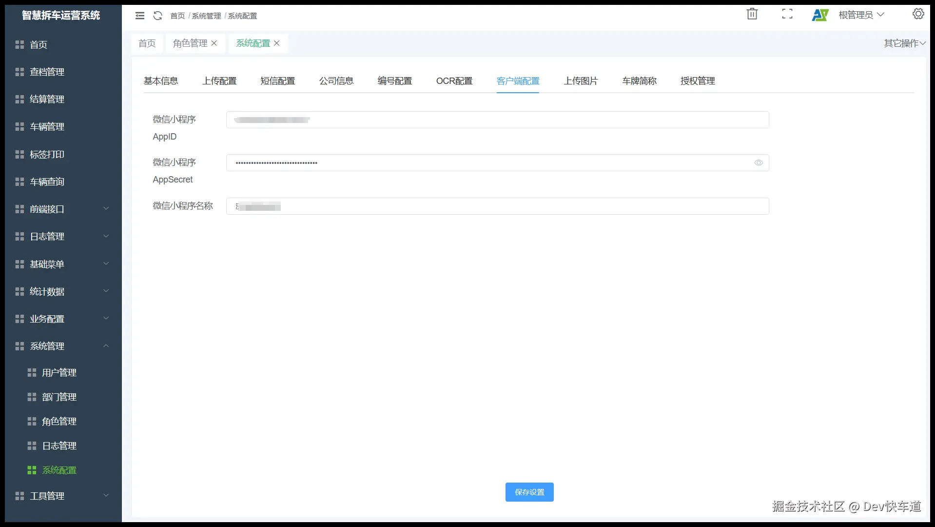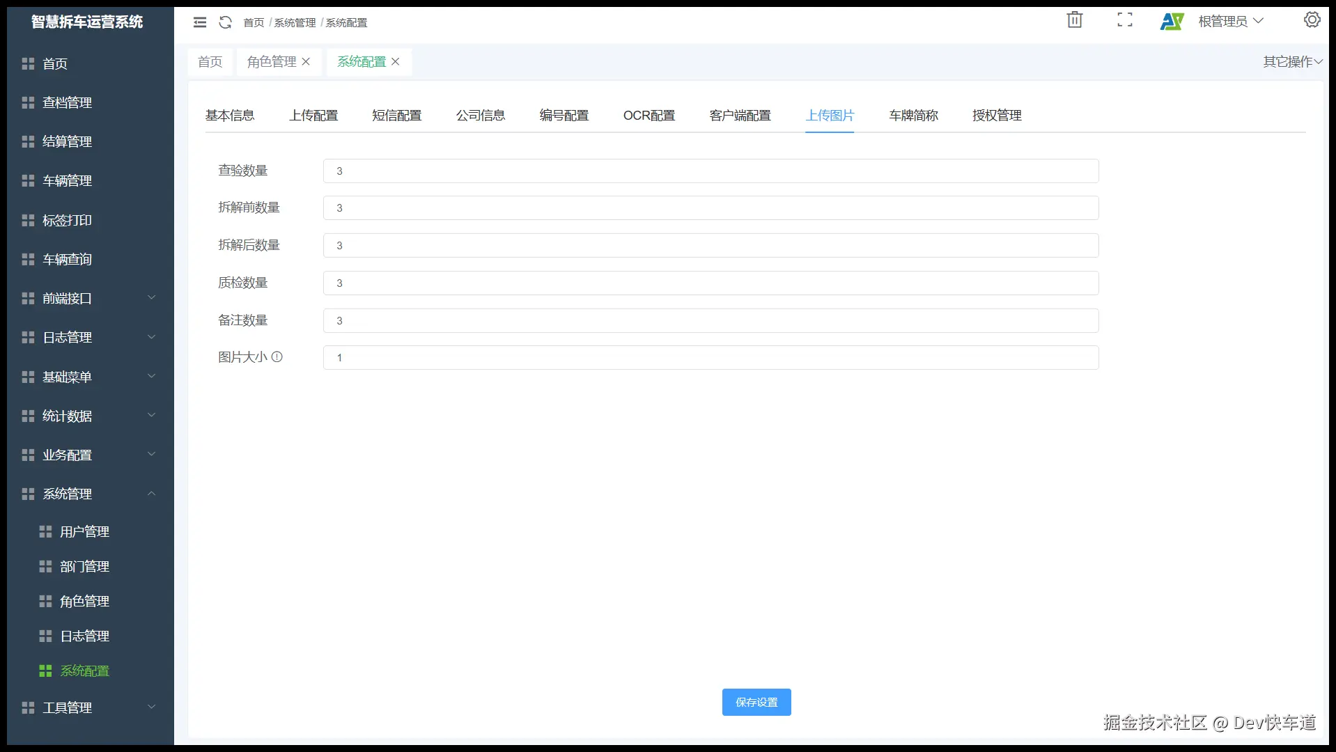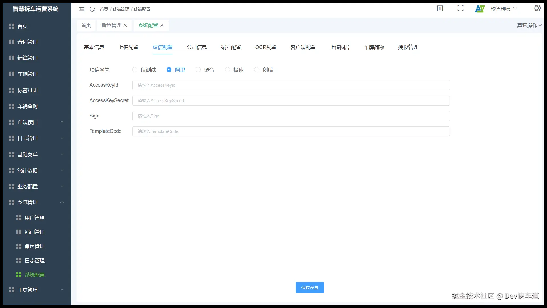 在我们的管理系统和业务系统中,会有很多需要配置的选项,诸如系统名称,上传规则,OCR接口配置等;我们通过系统配置 菜单,可以配置系统基本信息,上传、短信、公司、OCR、小程序端配置等;