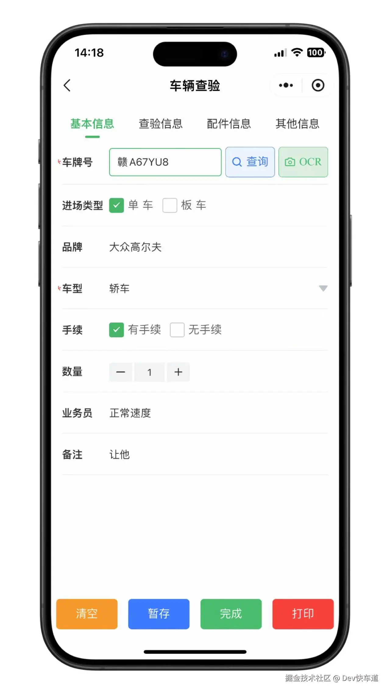 - 车辆预处理界面,根据实际情况,录入相关数据,点击暂存或者完成